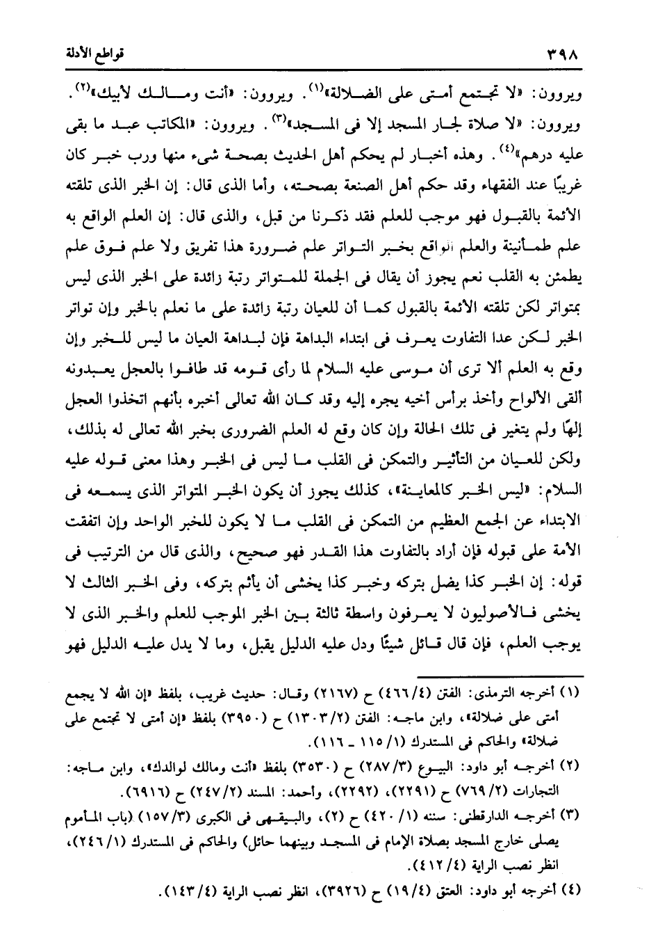 ويروون: "لا تجتمع أمتى على الضلالة" 1 ويروون: "أنت ومالك لأبيك" 2 ويروون: "لا صلاة لجار المسجد إلا فى المسجد" 3 ويروون: "المكاتب عبد ما بقى عليه درهم" 4 وهذه أخبار لم يحكم أهل الحديث بصحة شىء منها ورب خبر كان غريبا عند الفقهاء وقد حكم أهل الصنعة بصحته وأما الذى قال أن الخبر الذى تلقته الأئمة بالقبول فهو موجب للعلم فقد ذكرنا من قبل والذى قال أن العلم الواقع به علم طمأنينة والعلم الواقع بخبر التواتر علم ضرورة هذا تفريق ولا علم فوق علم يطمئن به القلب نعم يجوز أن يقال فى الجملة للمتواتر رتبة زائدة على الخبر الذى ليس بمتواتر لكن تلقته الأئمة بالقبول كما أن للعيان رتبة زائدة على ما نعلم بالخبر وأن تواتر الخبر لكن عدا التفاوت يعرف فى ابتداء البداهة فإن لبداهة العيان ما ليس للخبر وأن وقع به العلم إلا ترى أن موسى عليه السلام لما رأى قومه قد طافوا بالعجل يعبدونه ألقى الألواح وأخذ برأس أخيه يجره إليه وقد كان الله تعالى أخبره بأنهم اتخذوا العجل إلها ولم يتغير فى تلك الحالة وأن كان وقع له العلم الضرورى بخبر الله تعالى له بذلك ولكن للعيان من التأثير والتمكن فى القلب ما ليس فى الخبر وهذا معنى قوله عليه السلام ليس الخبر كالمعاينة كذلك يجوز أن يكون الخبر المتواتر الذى يسمعه فى الابتداء عن الجمع العظيم من التمكن فى القلب ما لا يكون للخبر الواحد وأن اتفقت الأمة على قبوله فإن أراد بالتفاوت هذا القدر فهو صحيح والذى قال من الترتيب فى قوله أن الخبر كذا يضل بتركه وخبر كذا يخشى أن يأثم بتركه وفى الخبر الثالث لا يخشى فالأصوليون لا يعرفون واسطة ثالثة بين الخبر الموجب للعلم والخبر الذى لا يوجب العلم فإن قال قائل شيئا ودل عليه الدليل يقبل وما لا يدل عليه الدليل فهو.