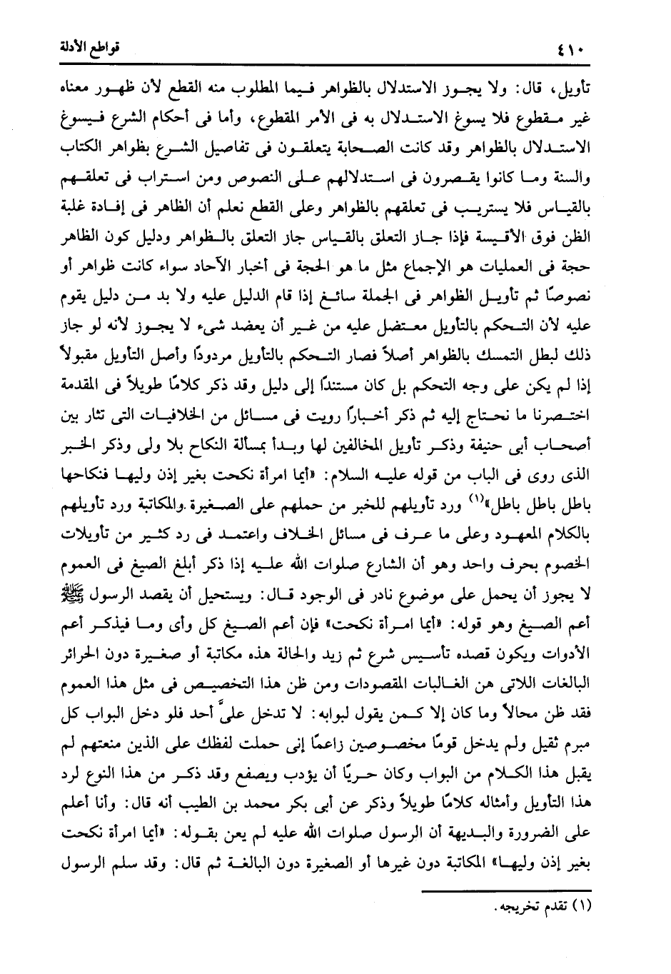 تأويل قال ولا يجوز الاستدلال بالظواهر فيما المطلوب منه القطع لأن ظهور معناه غير مقطوع فلا يسوغ الاستدلال به فى الأمر المقطوع وأما فى أحكام الشرع فيسوغ الاستدلال بالظواهر وقد كانت الصحابة يتعلقون فى تفاصيل الشرع بظواهر الكتاب والسنة وما كانوا يقصرون فى استدلالهم على النصوص ومن استراب فى تعلقهم بالقياس فلا يستريب فى تعلقهم بالظواهر وعلى القطع نعلم أن الظاهر فى إفادة غلبة الظن فوق الأقيسة فإذا جاز التعلق بالقياس جاز التعلق بالظواهر ودليل كون الظاهر حجة فى العمليات هو الإجماع مثل ما هو الحجة فى أخبار الآحاد سواء كانت ظواهر أو نصوصا ثم تأويل الظواهر فى الجملة سائغ إذا قام الدليل عليه ولا بد من دليل يقوم عليه لأن التحكم بالتأويل معتضل عليه من غير أن يعضد شىء لا يجوز لأنه لو جاز ذلك لبطل التمسك بالظواهر أصلا فصار التحكم بالتأويل مردودا وأصل التأويل مقبولا إذا لم يكن على وجه التحكم بل كان مستندا إلى دليل وقد ذكر كلاما طويلا فى المقدمة اختصرنا ما نحتاج إليه ثم ذكر أخبارا رويت فى مسائل من الخلافيات التى تثار بين أصحاب أبى حنيفة وذكر تأويل المخالفين لها وبدأ بمسألة النكاح بلا ولى وذكر الخبر الذى روى فى الباب من قوله عليه السلام: "أيما امرأة نكحت بغير إذن وليها فنكاحها باطل باطل باطل"1 ورد تأويلهم للخبر من حملهم على الصغيرة والمكاتبة ورد تأويلهم بالكلام المعهود وعلى ما عرف فى مسائل الخلاف واعتمد فى رد كثير من تأويلات الخصوم بحرف واحد وهو أن الشارع صلوات الله عليه إذا ذكر أبلغ الصيغ فى العموم لا يجوز أن يحمل على موضوع نادر في الوجود قال ويستحيل أن يقصد الرسول صلى الله عليه وسلم أعم الصيغ وهو قوله أيما امرأة نكحت فإن أعم الصيغ كل وأى وما فيذكر أعم الأدوات ويكون قصده تأسيس شرع ثم زيد والحالة هذه مكاتبة أو صغيرة دون الحرائر البالغات اللاتى هن الغالبات المقصودات ومن ظن هذا التخصيص فى مثل هذا العموم فقد ظن محالا وما كان إلا كمن يقول لبوابه لا تدخل على أحد فلو دخل البواب كل مبرم ثقيل ولم يدخل قوما مخصوصين زاعما إنى حملت لفظك على الذين منعتهم لم يقبل هذا الكلام من البواب وكان حريا أن يؤدب ويصفع وقد ذكر من هذا النوع لرد هذا التأويل وأمثاله كلاما طويلا وذكر عن أبى بكر محمد بن الطيب أنه قال وأنا أعلم على الضرورة والبديهة أن الرسول صلوات الله عليه لم يعن بقوله أيما امرأة نكحت بغير إذن وليها المكاتبة دون غيرها أو الصغيرة دون المبالغة ثم قال وقد سلم الرسول.
