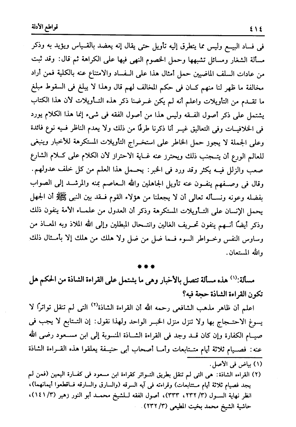 2 القراءة الشاذة: هي التي لم تنقل بطريق التواتر كقراءة ابن مسعود في كفارة اليمين "فمن لم يحد فصيام ثلاثة أيام متتابعات" وقراءته في آية السرقة "والسارق والسارقة فاقطعوا أيمانهما" انظر نهاية السول 3/232, 333 أصول الفقه للشيخ أبو النور زهير 3/141 حاشية الشيخ محمد بخيت المطيعي 3/232.