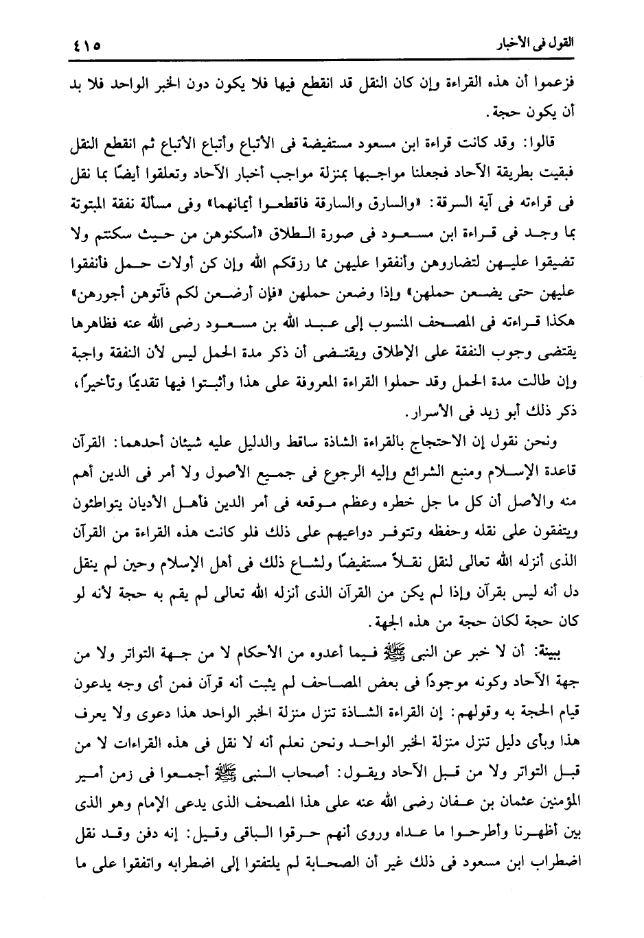 ببينة: أن لا خبر عن النبى صلى الله عليه وسلم فيما أعدوه من الأحكام لا من جهة التواتر ولا من جهة الآحاد وكونه موجودا فى بعض المصاحف لم يثبت أنه قرآن فمن أى وجه يدعون قيام الحجة به وقولهم أن القراءة الشاذة تنزل منزلة الخبر الواحد هذا دعوى ولا يعرف هذا وبأى دليل تنزل منزلة الخبر الواحد ونحن نعلم أنه لا نقل فى هذه القراءات لا من قبل التواتر ولا من قبل الآحاد ويقول أصحاب النبى صلى الله عليه وسلم أجمعوا فى زمن أمير المؤمنين عثمان بن عفان رضى الله عنه على هذا المصحف الذى يدعى الإمام وهو الذى بين أظهرنا وأطرحوا ما عداه وروى أنهم حرقوا الباقى وقيل أنه دفن وقد نقل اضطراب ابن مسعود فى ذلك غير أن الصحابة لم يلتفتوا إلى اضطرابه واتفقوا على ما.
