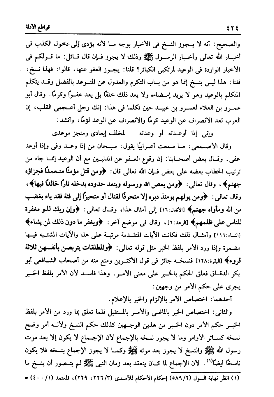 وقال الأصمعى ما سمعت أعرابيا يقول: سبحان من إذا وعد وفى وإذا أوعد عفى وقال بعض أصحابنا أن وقوع العفو عن المذنبين مع أن الوعيد إنما جاء من ترتيب الخطاب بعضه على بعض فإن الله تعالى قال ومن يقتل مؤمنا متعمدا فجزاؤه جهنم وقال تعالى: {وَمَنْ يَعْصِ اللَّهَ وَرَسُولَهُ وَيَتَعَدَّ حُدُودَهُ يُدْخِلْهُ نَاراً خَالِداً فِيهَا} وقال تعالى: {وَمَنْ يُوَلِّهِمْ يَوْمَئِذٍ دُبُرَهُ إِلَّا مُتَحَرِّفاً لِقِتَالٍ أَوْ مُتَحَيِّزاً إِلَى فِئَةٍ فَقَدْ بَاءَ بِغَضَبٍ مِنَ اللَّهِ وَمَأْوَاهُ جَهَنَّمُ} [لأنفال: 16] إلى أمثال هذا وقال تعالى: {وَإِنَّ رَبَّكَ لَذُو مَغْفِرَةٍ لِلنَّاسِ عَلَى ظُلْمِهِمْ} [الرعد: 6] وقال فى موضع آخر: {وَيَغْفِرُ مَا دُونَ ذَلِكَ لِمَنْ يَشَاءُ} [النساء: 116] وأمثال ذلك فكانت الآيات المتقدمة مرتبة على هذا والآيات المشتبه فيها مضمرة وإذا ورد الأمر بلفظ الخبر مثل قوله تعالى: {وَالْمُطَلَّقَاتُ يَتَرَبَّصْنَ بِأَنْفُسِهِنَّ ثَلاثَةَ قُرُوءٍ} [البقرة: 228] فنسخه جائز فى قول الأكثرين ومنع منه من أصحاب الشافعى أبو بكر الدقاق فعلق الحكم بالخبر على معنى الأمر وهذا فاسد لأن الأمر بلفظ الخبر يجرى على حكم الأمر من وجهين.