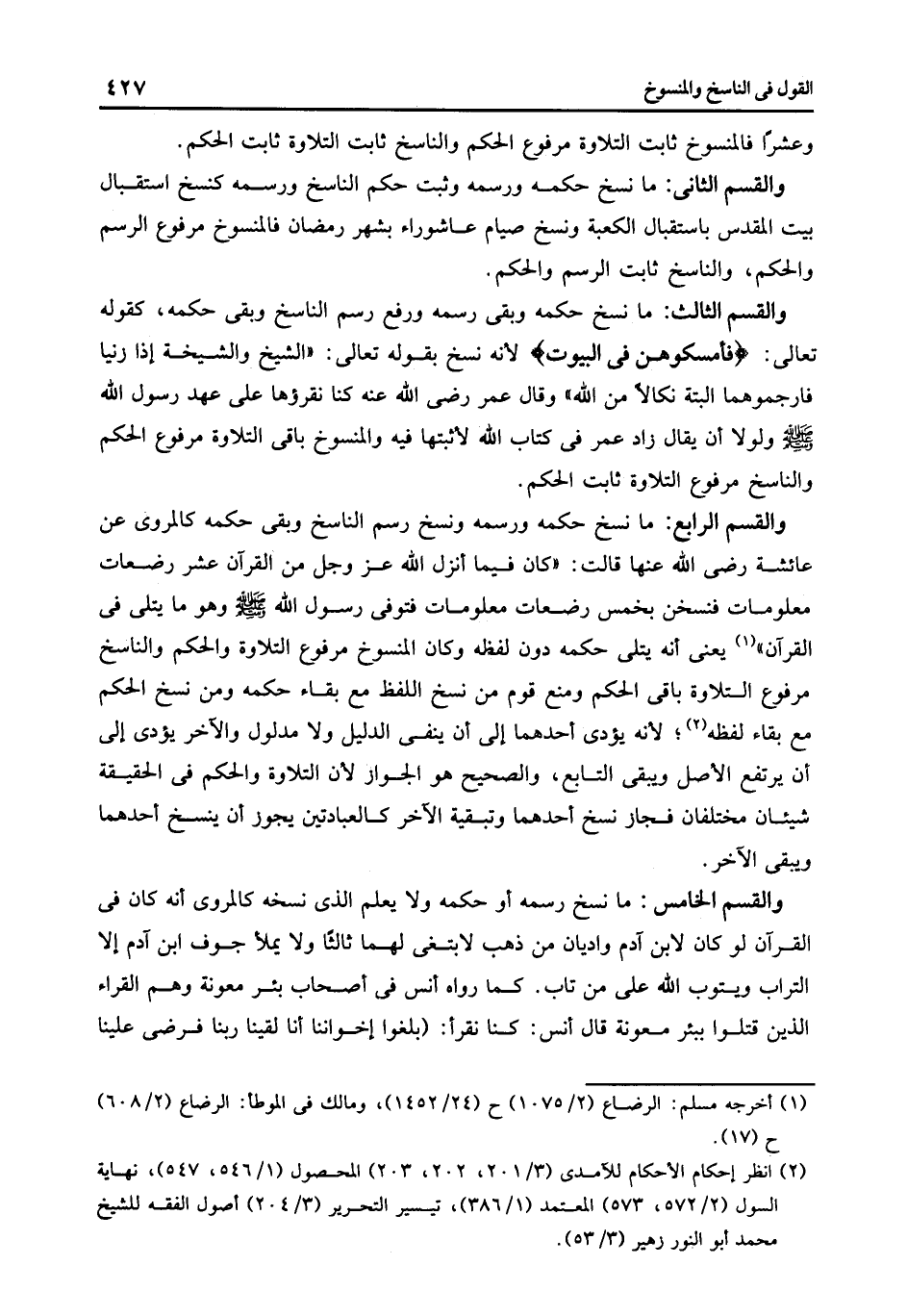 والقسم الرابع: ما نسخ حكمه ورسمة ونسخ رسم الناسخ وبقى حكمه كالمروى عن عائشة رضي الله عنها قالت كان فيما أنزل الله عز وجل من القرآن عشر رضعات معلومات فنسخن بخمس رضعات معلومات فتوفى رسول الله صلى الله عليه وسلم وهو ما يتلى في القرآن1 يعني أنه يتلى حكمه دون لفظه وكان المنسوخ مرفوع التلاوة والحكم والناسخ مرفوع التلاوة باقى الحكم ومنع قوم من نسخ اللفظ مع بقاء حكمه ومن نسخ الحكم مع بقاء لفظه2 لأنه يؤدي أحدهما إلى أن ينفي الدليل ولا مدلول والآخر يؤدي إلى أن يرتفع الأصل ويبقى التابع والصحيح هو الجواز لأن التلاوة والحكم في الحقيقة شيئان مختلفان فجاز نسخ أحدهما وتبقيه الآخر كالعبادتين يجوز أن ينسخ أحدهما ويبقي الآخر.
