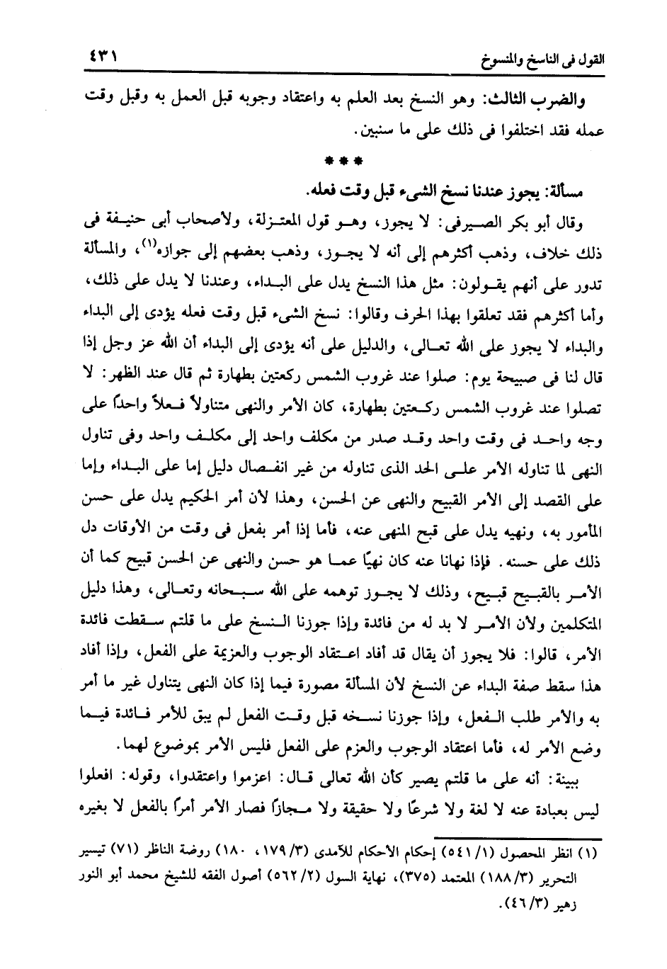 1 انظر المحصول 1/541 إحكام الأحكام للآمدي 3/179, 180 روضة الناظر 71 تيسير التحرير 3/188 المعتمد 375 نهاية السول 2/562 أصول الفقه للشيخ أبو النور زهير 3/46.