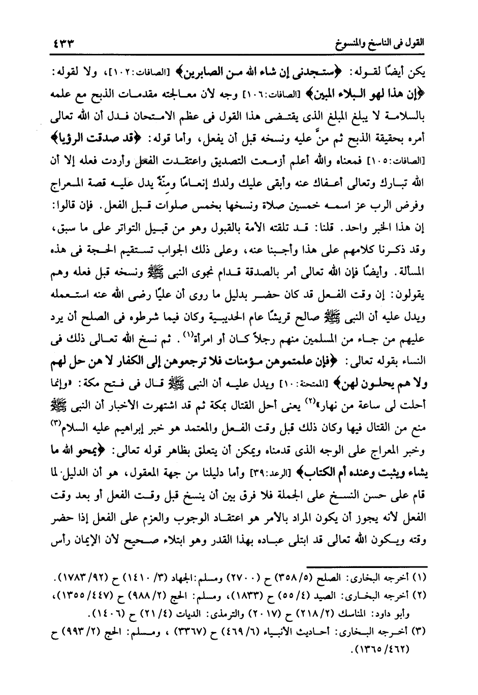 يمكن أيضا لقوله: {سَتَجِدُنِي إِنْ شَاءَ اللَّهُ مِنَ الصَّابِرِينَ} [الصافات: 102] ولا لقوله: {إِنَّ هَذَا لَهُوَ الْبَلاءُ الْمُبِينُ} [الصافات:106] وجه لأن معالجته مقدمات الذبح مع علمه بالسلامة لا يبلغ المبلغ الذي يقتضي هذا القول في عظم الامتحان فدل أن الله تعالى أمره بحقيقة الذبح ثم من عليه ونسخه قبل أن يفعل وأما قوله: {قَدْ صَدَّقْتَ الرُّؤْيا} [الصافات: 105] فمعناه والله أعلم أزمعت التصديق واعتقدت الفعل وأردت فعله إلا أن الله تبارك وتعالى أعفاك عنه وأبقى عليك ولدك انعاما ومنه يدل عليه قصة المعراج وفرض الرب عز اسمه خمسين صلاة ونسخها بخمس صلوات قبل الفعل فان قالوا: أن هذا الخبر واحد قلنا قد تلقته الأمة بالقبول وهو من قبيل التواتر على ما سبق وقد ذكرنا كلامهم على هذا وأجبنا عنه وعلى ذلك الجواب نستقيم الحجة في هذه المسألة وأيضا فإن الله تعالى أمر بالصدقة قدام نجوى النبي صلى الله عليه وسلم ونسخه قبل فعله وهم يقولون أن وقت الفعل قد كان حضر بدليل ما روى أن عليا رضي الله عنه استعمله ويدل عليه أن النبي صلى الله عليه وسلم صالح قريشا عام الحديبية وكان فيما شرطوه في الصلح أن يرد عليهم من جاء من المسلمين فيهم رجلا كان أو امرأة1 ثم نسخ الله تعالى ذلك فى النساء بقوله تعالى: {فَإِنْ عَلِمْتُمُوهُنَّ مُؤْمِنَاتٍ فَلا تَرْجِعُوهُنَّ إِلَى الْكُفَّارِ لا هُنَّ حِلٌّ لَهُمْ وَلا هُمْ يَحِلُّونَ لَهُنَّ} [الممتحنة: 10] ويدل عليه أن النبي صلى الله عليه وسلم قال فى فتح مكة: " وإنما أحلت لى ساعة من نهار" 2 يعنى أحل القتال بمكة ثم قد اشتهرت الأخبار أن النبي صلى الله عليه وسلم منع من القتال فيها وكان ذلك قبل وقت الفعل والمعتمد هو خير إبراهيم عليه السلام3 وخبر المعراج على الوجه الذي قدمناه ويمكن أن يتعلق بظاهر قوله تعالى: {يَمْحُوا اللَّهُ مَا يَشَاءُ وَيُثْبِتُ وَعِنْدَهُ أُمُّ الْكِتَابِ} [الرعد:39] وأما دليلنا من جهة المعقول هو أن الدليل لما قام على حسن النسخ على الجملة فلا فرق بين أن ينسخ قبل وقت الفعل أو بعد وقت الفعل لأنه يجوز أن يكون المراد بالأمر هو اعتقاد الوجوب والعزم على الفعل إذا حضر وقته وبكون الله تعالى قد ابتلى عباده بهذا القدر وهو ابتلاء صحيح لآن الإيمان رأس.