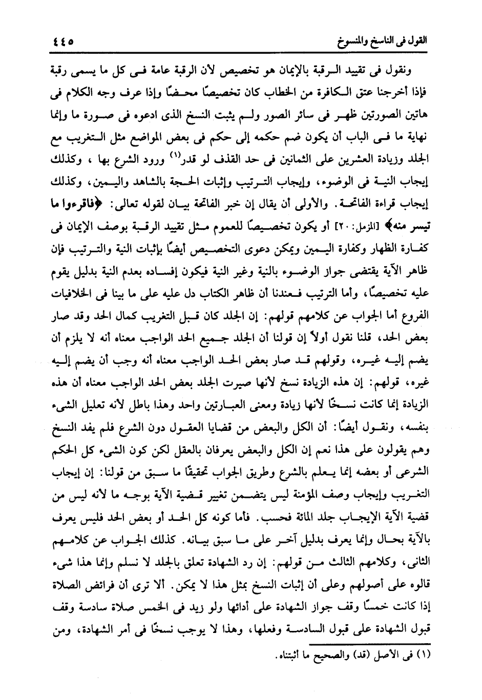 ونقول في تقيد الرقبة بالإيمان هو تخصيص لأن الرقبة عامة في كل ما يسمى رقبة فإذا أخرجنا عتق الكافرة من الخطاب كان تخصيصا محضا وإذا عرف وجه الكلام في هاتين الصورتين ظهر في سائر الصور ولم يثبت النسخ الذي ادعوه في صورة ما وإنما نهاية ما في الباب أن يكون ضم حكمه إلى حكم في بعض المواضع مثل التغريب مع الجلد وزيادة العشرين على الثمانين في حد القذف لو قدر1 ورود الشرع بها وكذلك إيجاب النية في الوضوء وإيجاب الترتيب وأثبات الحجة بالشاهد واليمين وكذلك إيجاب قراءة الفاتحة والأولى أن يقال أن خبر الفاتحة بيان لقوله تعالى: {فَاقْرَأُوا مَا تَيَسَّرَ مِنْهُ} [المزمل: 20] أو يكون تخصيصا للعموم مثل تقييد الرقبة بوصف الإيمان في كفارة الظهار وكفارة اليمين ويمكن دعوى التخصيص أيضا بإثبات النية والترتيب فإن ظاهر الآية يقتضي جواز الوضوء بالنية وغير النية فيكون إفساده بعدم النية بدليل يقوم عليه تخصيصا وأما الترتيب فعندنا أن ظاهر الكتاب دل عليه على ما بينا في الخلافيات الفروع أما الجواب عن كلامهم قولهم أن الجلد كان قبل التغريب كمال الحد وقد صار بعض الحد قلنا نقول أولا أن قولنا أن الجلد جميع الحد الواجب معناه أنه لا يلزم أن يضم إليه غيره وقولهم قد صار بعض الحد الواجب معناه أنه وجب أن يضم إليه غيره قولهم أن هذه الزيادة نسخ لأنها صيرت الجلد بعض الحد الواجب معناه أن هذه الزيادة إنما كانت نسخا لأنها زيادة ومعنى العبارتين واحد وهذا باطل لأنه تعليل الشيء بنفسه ونقول أيضا أن الكل والبعض من قضايا العقول دون الشرع فلم يفد النسخ وهم يقولون على هذا نعم أن الكل والبعض يعرفان بالعقل لكن كون الشيء كل الحكم الشرعي أو بعضه إنما يعلم بالشرع وطريق الجواب تحقيقا ما سبق من قولنا أن إيجاب التغريب وإيجاب وصف المؤمنة ليس يتضمن تغيير قضية الآية بوجه لما لأنه ليس من قضية الآية الإيجاب جلد المائة فحسب فأما كونه كل الحد أو بعض الحد فليس يعرف بالآية بحال وإنما يعرف بدليل آخر على ما سبق بيانه كذلك الجواب عن كلامهم الثاني وكلامهم الثالث من قولهم أن رد الشهادة تعلق بالجلد لا نسلم وإنما هذا شيء قالوه على أصولهم وعلى أن إثبات النسخ بمثل هذا لا يمكن ألا ترى أن فرائض الصلاة إذا كانت خمسا وقف جواز الشهادة على أدائها ولو زيد في الخمس صلاة سادسة وقف قبول الشهادة على قبول السادسة وفعلها وهذا لا يوجب نسخا في أمر الشهادة ومن.