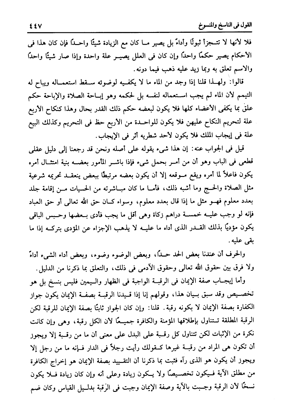 وأما إيجاب صفة الإيمان في الرقبة الواجبة في الظهار واليمين فليس بنسخ بل هو تخصيص وقد سبق بيان هذا وقولهم أنا إذا قيدنا الرقبة بصفة الإيمان يكون جواز الكفارة بصفة الإيمان لا بكونه رقبة قلنا وأن كان الجواز ثابتا بصفة الإيمان للرقبة لكن الرقبة المطلقة تتناول بإطلاقها المؤمنة والكافرة جميعا لأن الكل رقبة وهي وأن كانت نكرة من الإثبات لكن تتناول كل رقبة على البدل على معنى أن ما من رقبة إلا ويجوز أن تكون هي المراد من رقبة غيرها كقولك رأيت رجلا في الدار فانه ما من رجل إلا ويجوز أن يكون هو الذي رآه فثبت بما ذكرنا أن التقييد بصفة الإيمان هو إخراج الكافرة من مطلق الآية فيكون تخصيصا ولا يكون زيادة وعلى أنه وأن كان زيادة فلا يكون نسخا لأن الرقبة وجبت بالآية وصفة الإيمان وجبت في الرقبة بدليل القياس وكان ضم.