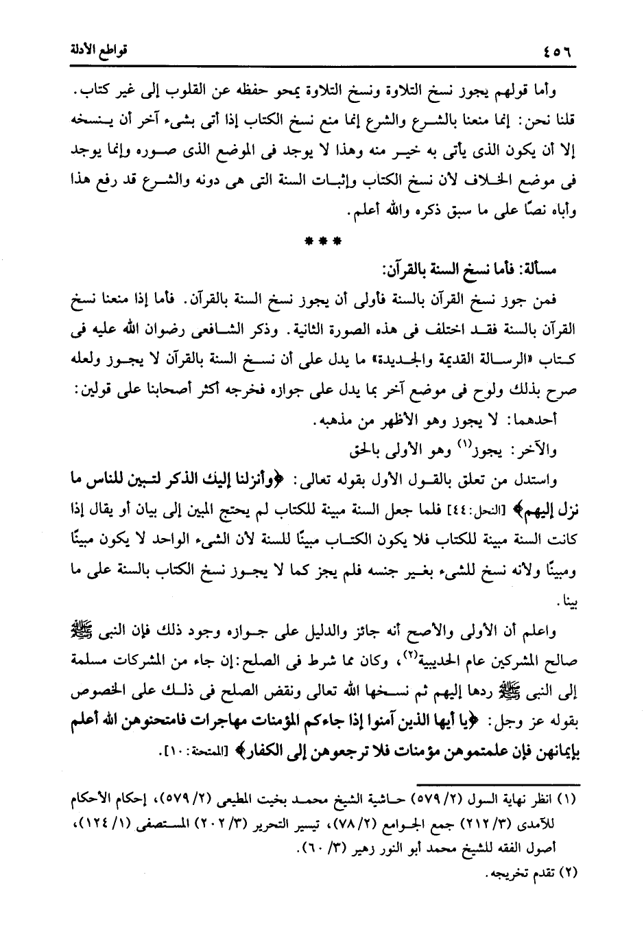 فمن جوز نسخ القرآن بالسنة فأولى أن يجوز نسخ السنة بالقرآن فأما إذا منعنا نسخ القرآن بالسنة فقد اختلف في هذه الصورة الثانية وذكر الشافعي رضوان الله عليه في كتاب الرسالة القديمة والجديدة ما يدل على أن نسخ السنة بالقرآن لا يجوز ولعله صرح بذلك ولوح فى موضع آخر بما يدل على جوازه فخرجه أكثر أصحابنا على قولين أحدهما لا يجوز وهو الأظهر من مذهبه.