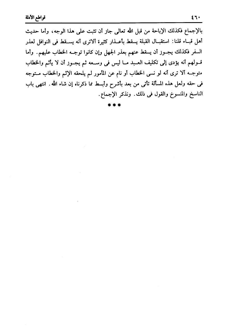 بالإجماع فكذلك الإباحة من قبل الله تعالى جاز أن تثبت على هذا الوجه وأما حديث أهل قباء قلنا استقبال القبلة يسقط بأعذار كثيرة إلا ترى أنه يسقط في النوافل لعذر السفر فكذلك يجوز أن يسقط عنهم بعذر الجهل وأن كانوا توجه الخطاب عليهم وأما قولهم أنه يؤدي إلى تكليف العبد ما ليس في وسعه ثم يجوز أن لا يأثم والخطاب متوجه إلا ترى أنه لو نسي الخطاب أو نام عن المأمور لم يلحقه الإثم والخطاب متوجه في حقه ولعل هذه المسألة تأتي من بعد بأشرح وأبسط مما ذكرناه أن شاء الله انتهى باب الناسخ والمنسوخ والقول في ذلك ونذكر الإجماع.
