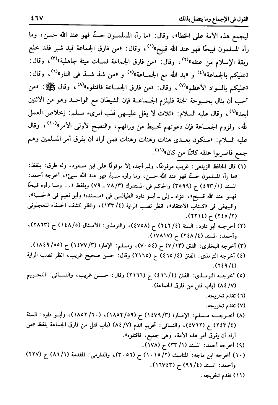 ليجمع هذه الأمة على الخطأ وقال: "ما رآه المسلمون حسنا فهو عند الله حسن وما رآه المسلمون قبيحا فهو عند الله قبيح" 1 وقال: "من فارق الجماعة قيد شبر فقد خلع ربقة الإسلام من عنقه" 2 وقال: "من فارق الجماعة فمات ميتة جاهلية" 3 وقال: "عليكم بالجماعة" 4 و "يد الله مع الجماعة" 5 و "من شذ شذ في النار" 6 وقال: "عليكم بالسواد الأعظم" 7 وقال: "من فارق الجماعة فاقتلوه" 8 وقال صلى الله عليه وسلم: "من أحب أن ينال بحبوحة الجنة فليلزم الجماعة فإن الشيطان مع الواحد وهو من الاثنين أبعد" 9 وقال صلى الله عليه وسلم: " ثلاث لا يغل عليهن قلب امرئ مسلم إخلاص العمل لله ولزوم الجماعة فإن دعوتهم تحيط من ورائهم والنصح لأولي الأمر" 10 وقال صلى الله عليه وسلم ستكون بعدي هنات وهنات فمن أراد أن يفرق أمر المسلمين وهم جمع فاضربوا عنقه كائنا من كان11.