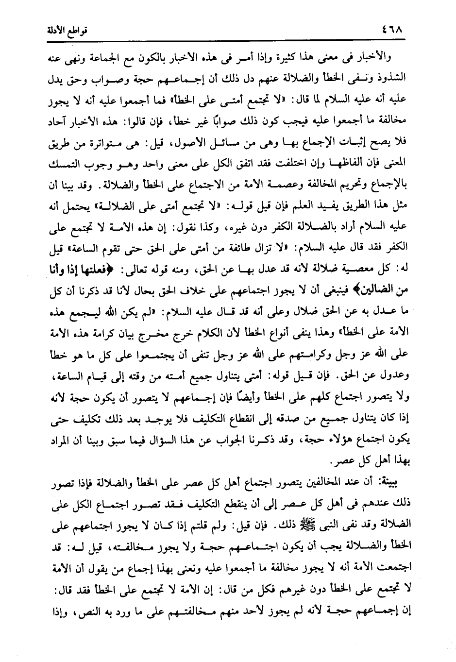 ببينة: أن عند المخالفين يتصور اجتماع أهل كل عصر على الخطأ والضلالة فإذا تصور ذلك عندهم في أهل كل عصر إلى أن ينقطع التكليف فقد تصور اجتماع الكل على الضلالة وقد نفى النبي صلى الله عليه وسلم ذلك فإن قيل ولم قلتم إذا كان لا يجوز اجتماعهم على الخطأ والضلالة يجب أن يكون اجتماعهم حجة ولا يجوز مخالفته قيل له قد اجتمعت الأمة أنه لا يجوز مخالفة ما أجمعوا عليه ونعني بهذا إجماع من يقول: أن الأمة لا تجتمع على الخطأ دون غيرهم فكل من قال أن الأمة لا تجتمع على الخطأ فقد قال أن إجماعهم حجة لأنه لم يجوز لأحد منهم مخالفتهم على ما ورد به النص وإذا