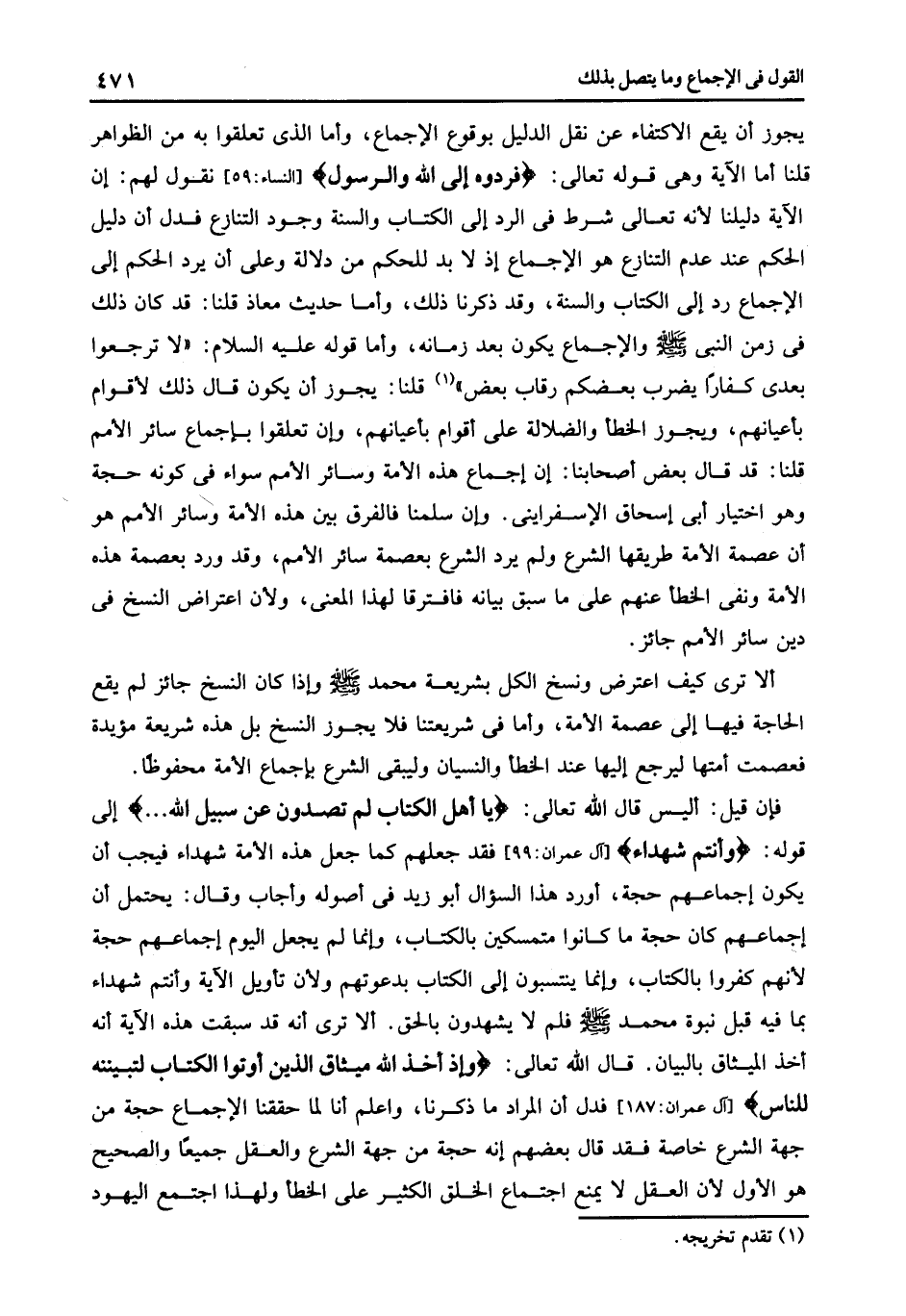 يجوز أن يقع الاكتفاء عن نقل الدليل بوقوع الإجماع وأما الذي تعلقوا به من الظواهر قلنا أما الآية وهي قوله تعالى: {فَرُدُّوهُ إِلَى اللَّهِ وَالرَّسُولِ} [النساء: 59] نقول لهم أن الآية دليلنا لأنه تعالى شرط في الرد إلى الكتاب والسنة وجود التنازع فدل أن دليل الحكم عند عدم التنازع هو الإجماع إذ لا بد للحكم من دلالة وعلى أن يرد الحكم إلى الإجماع رد إلى الكتاب والسنة وقد ذكرنا ذلك وأما حديث معاذ قلنا قد كان ذلك في زمن النبي صلى الله عليه وسلم والإجماع يكون بعد زمانه وأما قوله عليه السلام: "لا ترجعوا بعدى كفارا يضرب بعضكم رقاب بعض" 1 قلنا يجوز أن يكون قال ذلك لأقوام بأعيانهم ويجوز الخطأ والضلالة على أقوام بأعيانهم وأن تعلقوا بإجماع سائر الأمم قلنا قد قال بعض أصحابنا أن إجماع هذه الأمة وسائر الأمم سواء في كونه حجة وهو اختيار أبي إسحاق الإسفراينى وإن سلمنا فالفرق بين هذه الأمة وسائر الأمم هو أن عصمة الأمة طريقها الشرع ولم يرد الشرع بعصمة سائر الأمم وقد ورد بعصمة هذه الأمة ونفى الخطأ عنهم على ما سبق بيانه فافترقا لهذا المعنى ولأن اعتراض النسخ في دين سائر الأمم جائز.