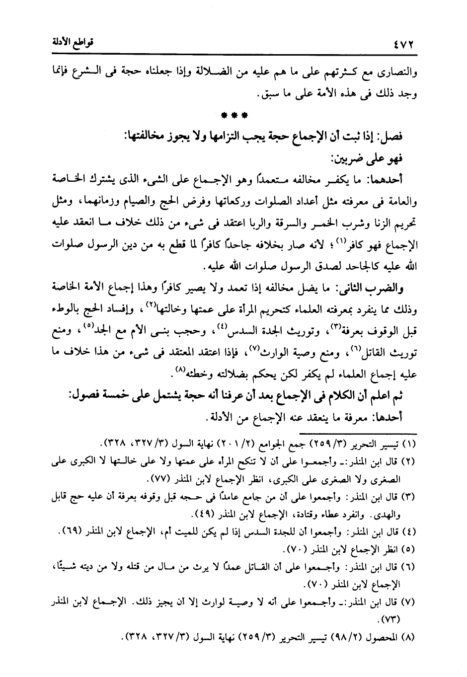 والضرب الثاني: ما يضل مخالفه إذا تعمد ولا يصير كافرا وهذا إجماع الأمة الخاصة وذلك مما ينفرد بمعرفته العلماء كتحريم المرأة على عمتها وخالتها2 وإفساد الحج بالوطء قبل الوقوف بعرفة3 وتوريث الجدة السدس4 وحجب بني الأم مع الجد5 ومنع توريث القاتل6 ومنع وصية الوارث7 فإذا اعتقد المعتقد في شيء من هذا خلاف ما عليه إجماع العلماء لم يكفر لكن يحكم بضلالته وخطئه8.