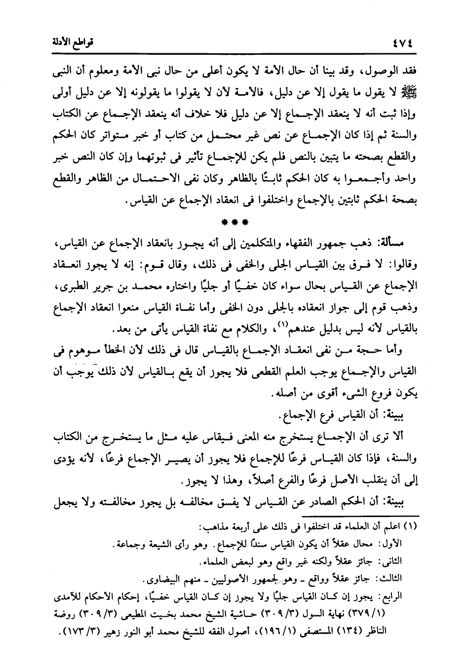 مسألة: ذهب جمهور الفقهاء والمتكلمين إلى أنه يجوز بانعقاد الإجماع عن القياس وقالوا: لا فرق بين القياس الجلي والخفي في ذلك وقال قوم أنه لا يجوز انعقاد الإجماع عن القياس بحال سواء كان خفيا أو جليا واختاره محمد بن جرير الطبري وذهب قوم إلى جواز انعقاده بالجلي دون الخفي وأما نفاة القياس منعوا انعقاد الإجماع بالقياس لأنه ليس بدليل عندهم1 والكلام مع نفاة القياس يأتى من بعد.