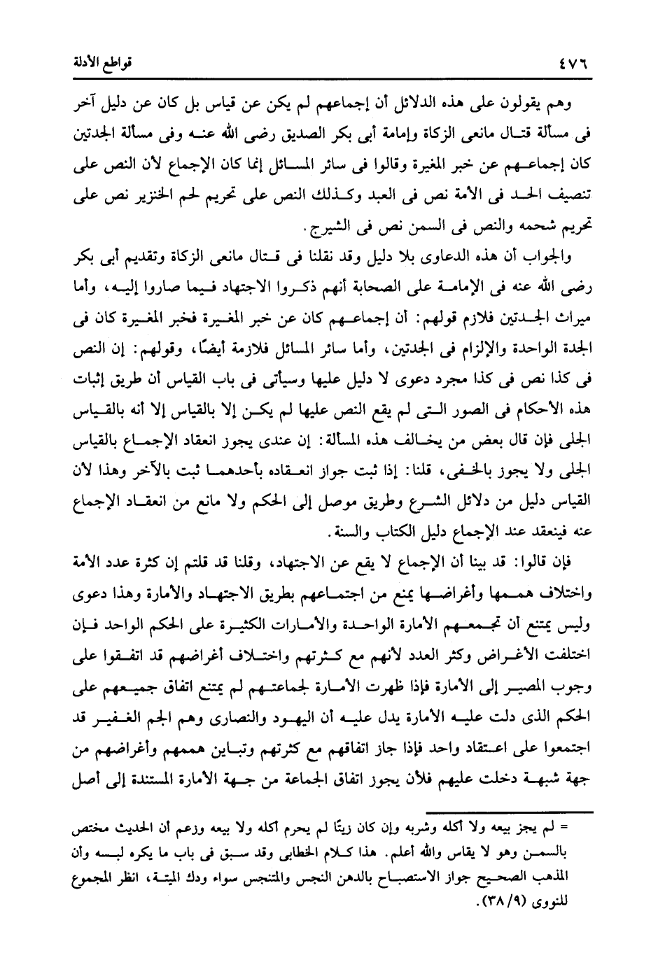 وهم يقولون على هذه الدلائل أن إجماعهم لم يكن عن قياس بل كان عن دليل آخر في مسألة قتال مانعي الزكاة وإمامة أبى بكر الصديق رضي الله عنه وفي مسألة الجدتين كان إجماعهم عن خبر المغيرة وقالوا: في سائر المسائل إنما كان الإجماع لأن النص على تنصيف الحد في الأمة نص في العبد وكذلك النص على تحريم لحم الخنزير نص على تحريم شحمه والنص في السمن نص في الشيرج.