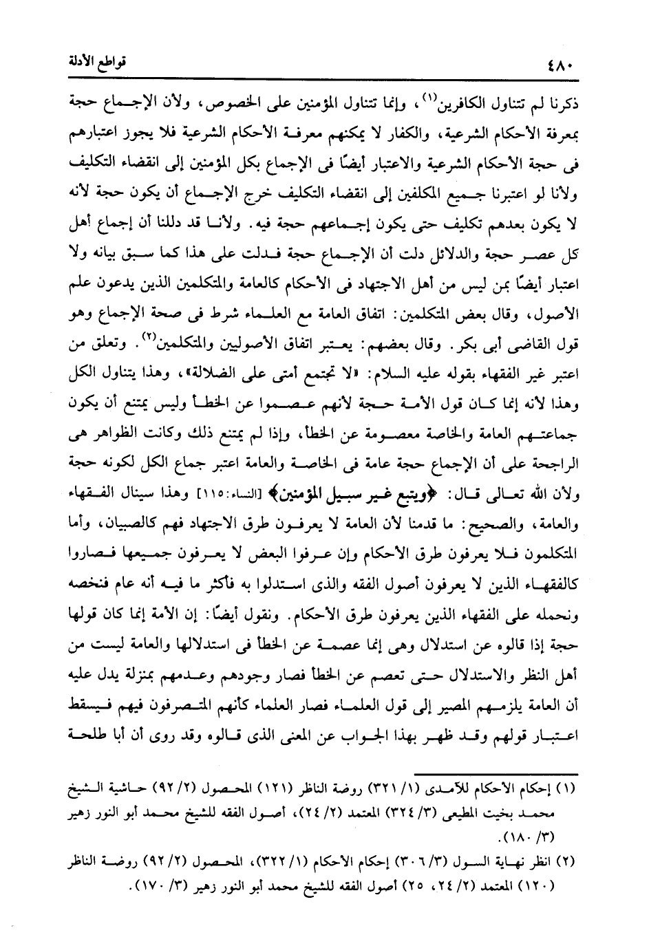 ذكرنا لم تتناول الكافرين1 وإنما تتناول المؤمنين على الخصوص ولأن الإجماع حجة بمعرفة الأحكام الشرعية والكفار لا يمكنهم معرفة الأحكام الشرعية فلا يجوز اعتبارهم في حجة الأحكام الشرعية والاعتبار أيضا في الإجماع بكل المؤمنين إلى انقضاء التكليف ولأنا لو اعتبرنا جميع المكلفين إلى انقضاء التكليف خرج الإجماع أن يكون حجة لأنه لا يكون بعدهم تكليف حتى يكون إجماعهم حجة فيه ولأنا قد دللنا أن إجماع أهل كل عصر حجة والدلائل دلت أن الإجماع حجة فدلت على هذا كما سبق بيانه ولا اعتبار أيضا بمن ليس من أهل الاجتهاد في الأحكام كالعامة والمتكلمين الذين يدعون علم الأصول وقال بعض المتكلمين اتفاق العامة مع العلماء شرط في صحة الإجماع وهو قول القاضي أبي بكر وقال بعضهم يعتبر اتفاق الأصوليين والمتكلمين2 وتعلق من هذا اعتبر غير الفقهاء بقوله عليه السلام لا تجتمع أمتي على الضلالة وهذا يتناول الكل وهذا لأنه إنما كان قول الأمة حجة لأنهم عصموا عن الخطأ وليس يمتنع أن يكون جماعتهم العامة والخاصة معصومة عن الخطأ وإذا لم يمتنع ذلك وكانت الظواهر هي الراجحة على أن الإجماع حجة عامة في الخاصة والعامة اعتبر جماع الكل لكونه حجة ولأن الله تعالى قال: {وَيَتَّبِعْ غَيْرَ سَبِيلِ الْمُؤْمِنِينَ} [النساء: 115] وهذا سينال الفقهاء والعامة والصحيح ما قدنا لأن العامة لا يعرفون طرق الاجتهاد فهم كالصبيان وأما المتكلمون فلا يعرفون طرق الأحكام وأن عرفوا البعض لا يعرفون جميعها فصاروا كالفقهاء الذين لا يعرفون طرق أصول الفقه والذي استدلوا به فأكثر ما فيه أنه عام فنخصه ونحمله على الفقهاء الذين يعرفون طرق الأحكام ونقول أيضا أن الأمة إنما كان قولها حجة إذا قالوه عن استدلال وهي إنما عصمة عن الخطأ في استدلالها والعامة ليست من أهل النظر والاستدلال حتى تعصم عن الخطأ فصار وجودهم وعدمهم بمنزلة يدل عليه أن العامة يلزمهم المصير إلى قول العلماء فصار العلماء كأنهم المتصرفون فيهم فيسقط اعتبار قولهم وقد ظهر بهذا الجواب عن المعنى الذي قالوه وقد روى أن أبا طلحة.