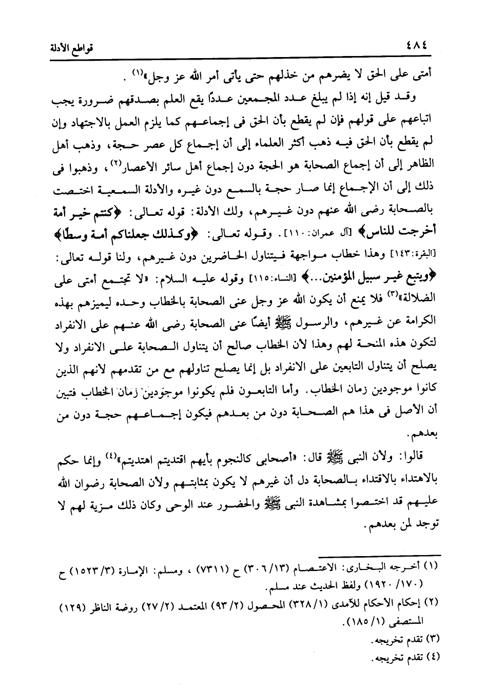 قالوا: ولأن النبي صلى الله عليه وسلم قال: "أصحابي كالنجوم بأيهم اقتديتم اهتديتم" 4 وإنما حكم بالاهتداء بالاقتداء بالصحابة دل أن غيرهم لا يكون بمثابتهم ولأن الصحابة رضوان الله عليهم قد اختصوا بمشاهدة النبي صلى الله عليه وسلم والحضور عند الوحي وكان ذلك مزية لهم لا توجد لمن بعدهم.
