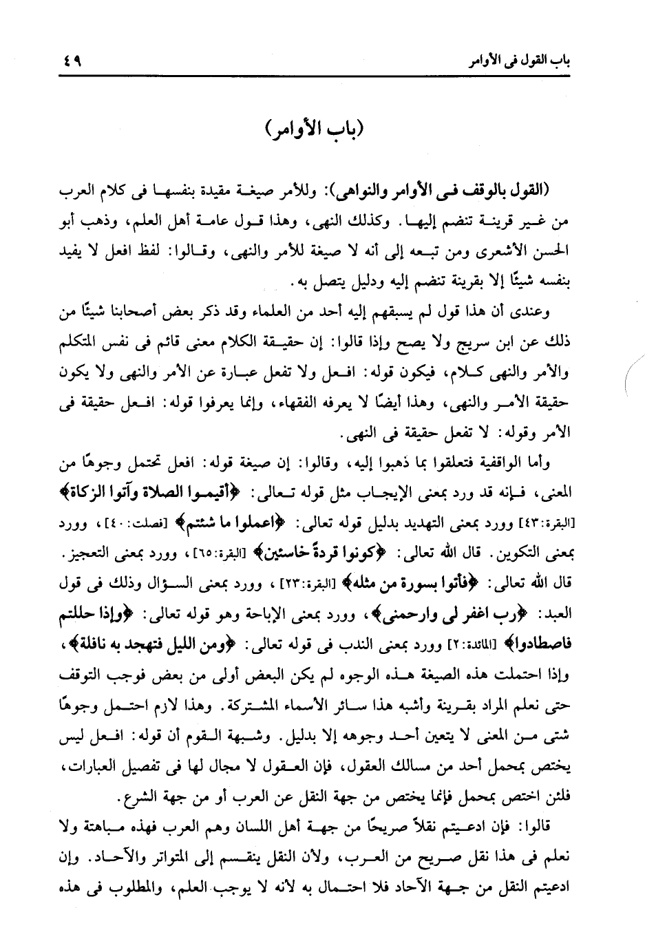 القول بالوقف في الأوامر والنواهى: وللأمر صيغة مقيدة بنفسها في كلام العرب من غير قرينة تنضم إليها وكذلك النهى وهذا قول عامة أهل العلم وذهب أبو الحسن الاشعري ومن تبعه إلى أنه لاصيغة للأمر والنهى وقالوا: لفظ افعل لا يفيد بنفسه شيئا إلا بقرينة تنضم إليه ودليل يتصل به.
