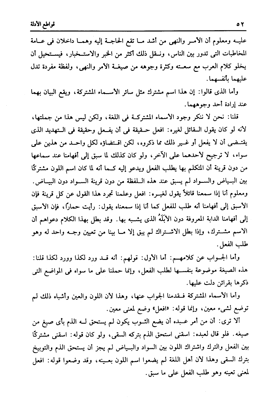 قلنا نحن لاننكر وجود الأسماء المشتركة في اللغة ولكن ليس هذا من جملتها لانه لو كان يقول القائل لغيره افعل حقيقة في أن يفعل وحقيقة في التهديد الذي يقتضى في أن لا يفعل أو غير ذلك مما ذكروه لكن اقتضاؤه لكل واحد من هذين على سواء لا ترجيح لأحدهما على الآخر ولو كان كذلك لما سبق إلى افهامنا عند سماعها من دون قرينة أن المتكلم بها يطلب الفعل ويدعو إليه كما أنه لما كان اسم اللون مشتركا بين البياض والسواد لم يسبق عند هذه اللفظة من دون قرينة السواد دون البياض ومعلوم أنا إذا سمعنا قائلا يقول لغيره افعل وعلمنا تجرد هذا القول عن كل قرينة فإن الاسبق إلى افهامنا أنه طلب للفعل كما انا إذا سمعناه يقول: رأيت حمارا فإن الاسبق إلى أفهامنا الدابة المعروفة دون الابله الذي يشبه بها وقد بطل بهذا الكلام دعواهم أن الاسم المشترك وإذا بطل الاشتراك لم يبق إلا ما بينا من تعيين وجه واحد له وهو طلب الفعل.