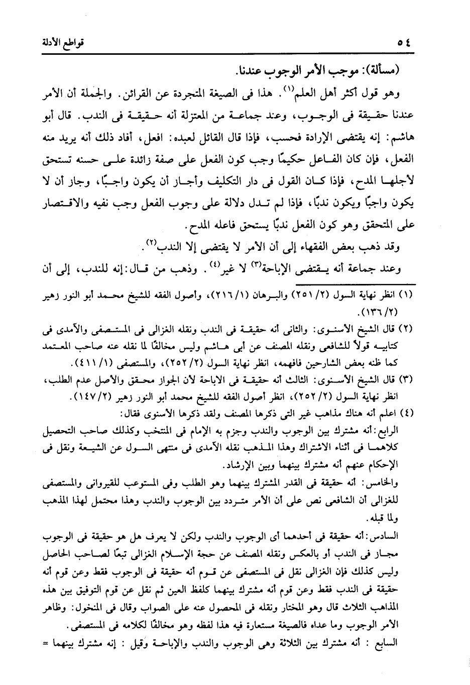 الرابع أنه مشترك بين الوجوب والندب وجزم به الإمام في المنتخب وكذلك صاحب التحصيل كلاهما في أثناء الاشتراك وهذا المذهب نقله الآمدي في منتهى السول عن الشيعة ونقل في الإحكام عنهم أنه مشترك بينهما وبين الإرشاد.