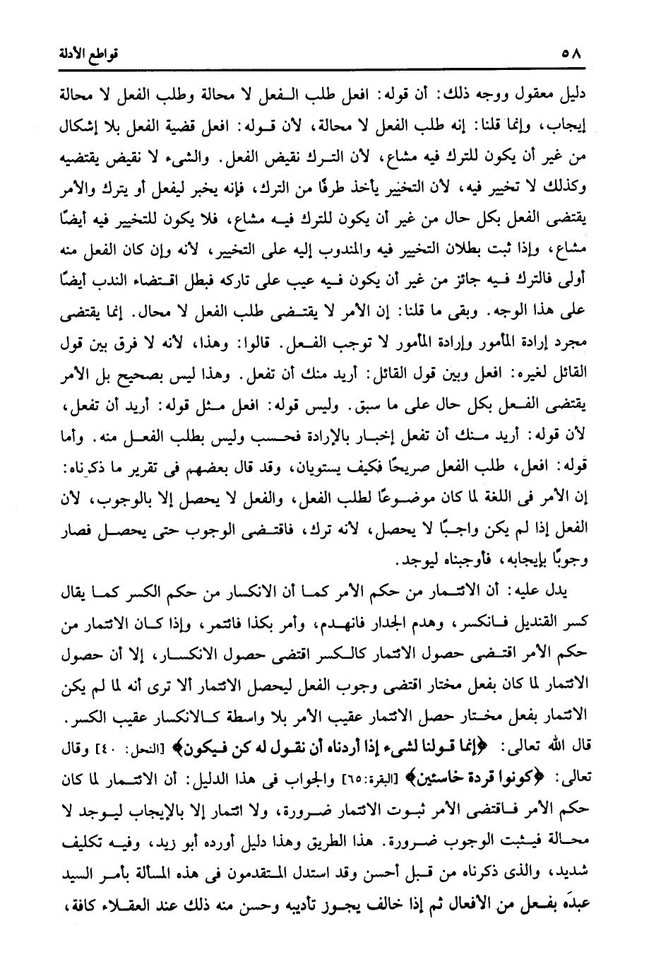 يدل عليه أن الائتمار من حكم الأمر كما أن الانكسار من حكم الكسر كما يقال كسر القنديل فانكسر وهدم الجدار فانهدم وأمر بكذا فائتمر وإذا كان الائتمار من حكم الأمر اقتضى حصول الائتمار كالكسر اقتضى حصول الانكسار إلا أن حصول الائتمار لما كان بفعل مختار اقتضى وجوب الفعل ليحصل الائتمار إلا ترى أنه لما لم يكن الائتمار بفعل مختار حصل الائتمار عقيب الأمر بلا واسطة كالانكسار عقيب الكسر قال الله تعالى: {إِنَّمَا قَوْلُنَا لِشَيْءٍ إِذَا أَرَدْنَاهُ أَنْ نَقُولَ لَهُ كُنْ فَيَكُونُ} [النحل: 40] وقال تعالى: {كُونُوا قِرَدَةً خَاسِئِينَ} والجواب في هذا الدليل أن الائتمار لما كان حكم الأمر فاقتضى الأمر ثبوت الائتمار ضرورة ولا ائتمار إلا بالأيجاب ليوجد لا محالة فيثبت الوجوب ضرورة هذا الطريق وهذا دليل اورده أبو زيد وفيه تكليف شديد والذي ذكرناه من قبل احسن وقد استدل المتقدمون في هذه المسالة بأمر السيد عبده بفعل من الافعال ثم إذا خالف يجوز تاديبه وحسن منه ذلك عند العقلاء كافة.