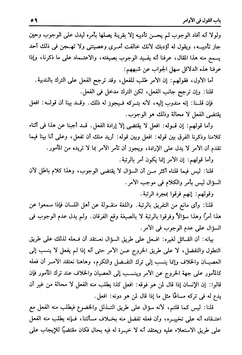 واما قولهم أن قوله افعل لا يقتضى إلا ارادة الفعل قد اجبنا عن هذا في اثناء كلامنا وذكرنا الفرق بين قوله افعل وبين قوله اريد منك أن تفعل وعلى انا بينا فيما تقدم أن الأمر لا يدل على الارادة ويجوز أن تأمر الأمر بما لا تريده من المأمور.