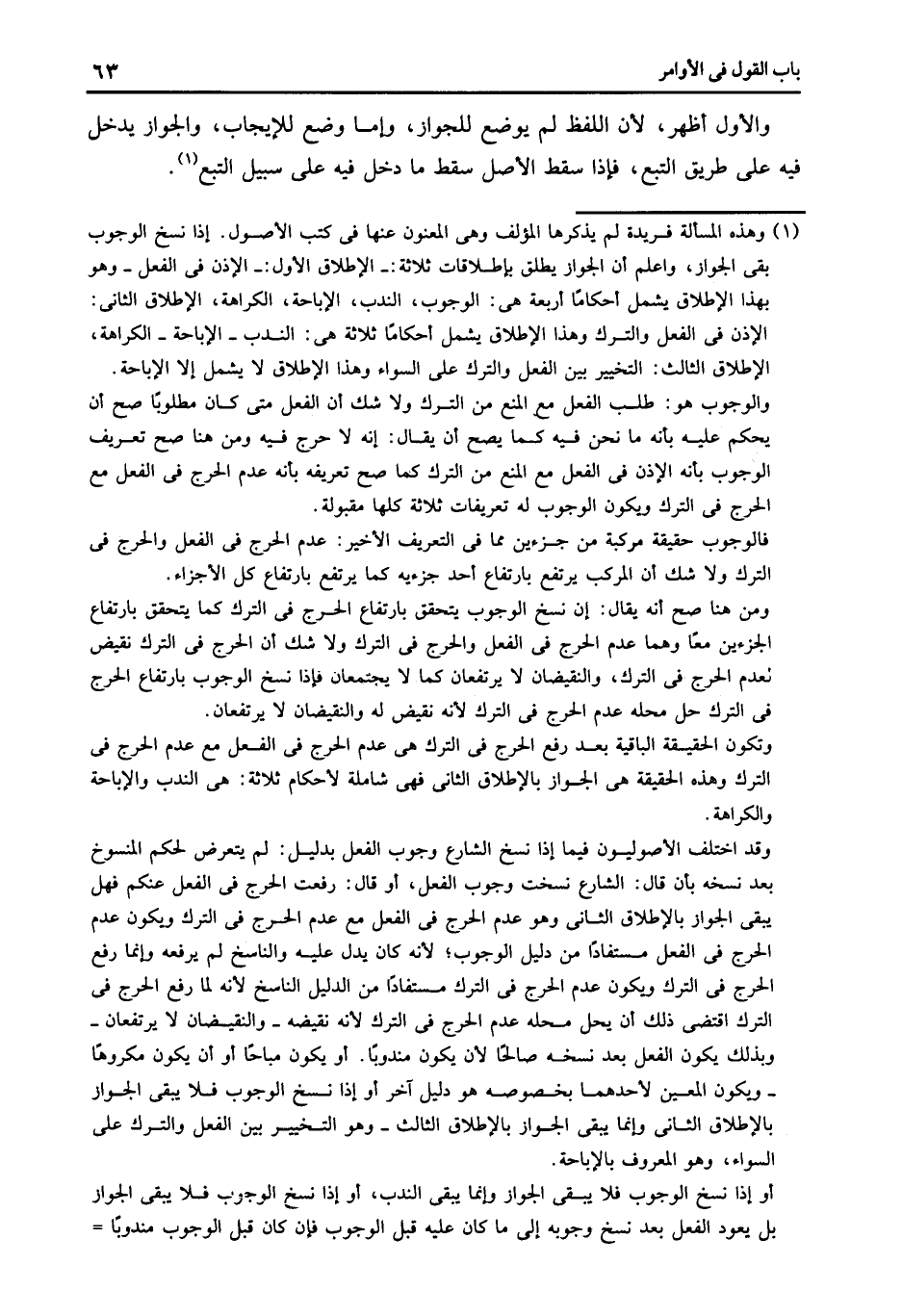 وتكون الحقيقة الباقية بعد رفع الحرج في الترك هي عدم الحرج في الفعل مع عدم الحرج في الترك وهذه الحقيقة هي الجواز بالإطلاق الثاني فهي شاملة لأحكام ثلاثة هي الندب والإباحة والكراهة.