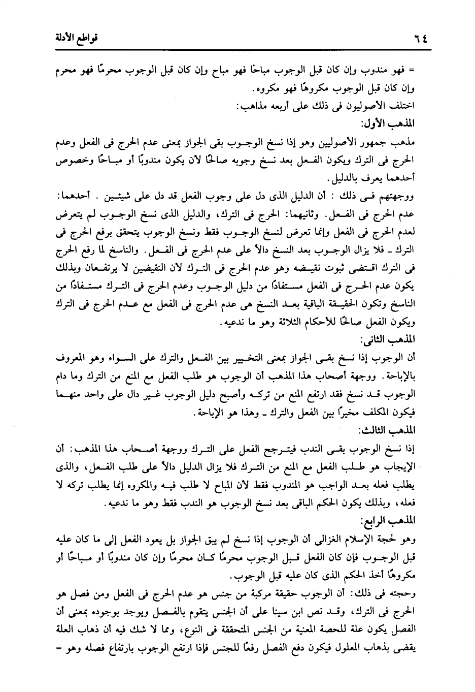 وحجته في ذلك: أن الوجوب حقيقة مركبة من جنس هو عدم الحرج في الفعل ومن فصل هو الحرج في الترك وقد نص ابن سينا على أن الجنس يتقوم بالفصل ويوجد بوجوده بمعنى أن الفصل يكون علة للحصة المعنية من الجنس المتحققة في النوع ومما لا شك فيه أن ذهاب العلة يقضى بذهاب المعلول فيكون دفع الفصل رفعا للجنس فإذا ارتفع الوجوب بارتفاع فصله وهو.............=