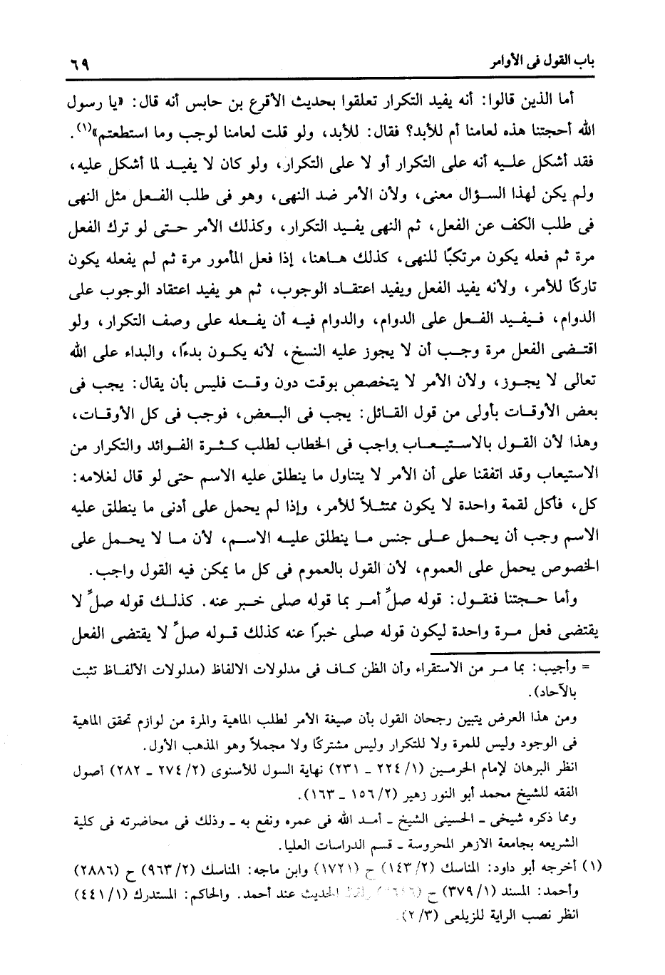 أما الذين قالوا: أنه يفيد التكرار تعلقوا بحديث الاقرع بن حابس أنه قال يا رسول الله احجتنا هذه لعامنا أم للابد فقال: "للابد ولو قلت: لعامنا لوجب وما استطعتم" 1.