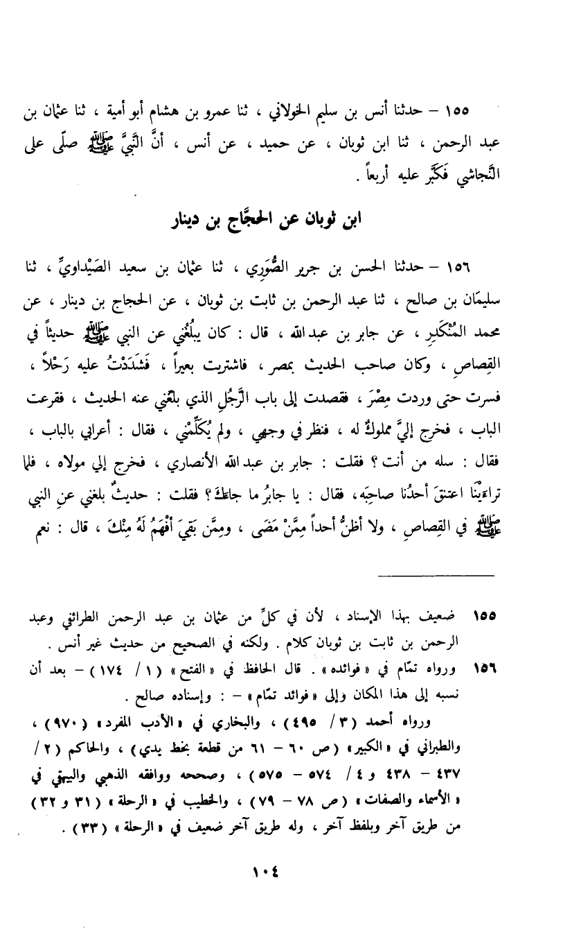 156 - حَدَّثَنَا الْحَسَنُ بْنُ جَرِيرٍ الصُّورِيُّ، ثنا عُثْمَانُ بْنُ سَعِيدٍ الصَّيْدَاوِيُّ، ثنا سُلَيْمَانُ بْنُ صَالِحٍ، ثنا عَبْدُ الرَّحْمَنِ بْنُ ثَابِتِ بْنِ ثَوْبَانَ، عَنِ الْحَجَّاجِ بْنِ دِينَارٍ، عَنْ مُحَمَّدٍ الْمُنْكَدِرِ، عَنْ جَابِرِ بْنِ عَبْدِ اللَّهِ، قَالَ: كَانَ يَبْلُغْنِي عَنِ النَّبِيِّ صَلَّى اللهُ عَلَيْهِ وَسَلَّمَ حَدِيثٌ فِي الْقِصَاصِ , وَكَانَ صَاحِبُ الْحَدِيثِ بِمِصْرَ , فَاشْتَرَيْتُ بَعِيرًا فَشَدَدْتُ عَلَيْهِ رَحْلًا فَسِرْتُ حَتَّى وَرَدْتُ مِصْرَ , فَقَصَدْتُ إِلَى بَابِ الرَّجُلِ الَّذِي بَلَغَنِي عَنْهُ الْحَدِيثُ , فَقَرَعْتُ الْبَابَ فَخَرَجَ إِلَيَّ مَمْلُوكٌ لَهُ فَنَظَرَ فِي وَجْهِيَ وَلَمْ يُكَلِّمْنِي , فَقَالَ: أَعْرَابِيُّ بِالْبَابِ فَقَالَ: سَلْهُ مَنْ أَنْتَ؟ فَقُلْتُ: جَابِرُ بْنُ عَبْدِ اللَّهِ الْأَنْصَارِيُّ فَخَرَجَ إِلَيَّ مَوْلَاهُ فَلَمَّا تَرَاءَيْنَا اعْتَنَقَ أَحَدُنَا صَاحِبَهُ , فَقَالَ: يَا جَابِرُ مَا جَاءَكَ؟ فَقُلْتُ: حَدِيثٌ بَلَغَنِي عَنِ النَّبِيِّ صَلَّى اللهُ عَلَيْهِ وَسَلَّمَ فِي الْقِصَاصِ وَلَا أَظُنُّ أَحَدًا مِمَّنْ مَضَى وَمِمَّنْ بَقِيَ أَفْهَمَ لَهُ مِنْكَ , قَالَ: نَعَمْ يَا جَابِرُ , سَمِعْتُ رَسُولَ اللَّهِ صَلَّى اللهُ عَلَيْهِ وَسَلَّمَ يَقُولُ: " إِنَّ اللَّهَ §يَبْعَثُكُمْ يَوْمَ الْقِيَامَةِ مِنْ قُبُورِكُمْ حُفَاةً عُرَاةً بُهْمًا , يُنَادِي بِصَوْتٍ رَفِيعٍ غَيْرِ فَظِيعٍ , يَسْمَعُ مَنْ بَعُدَ كَمَنْ قَرُبَ , فَيَقُولُ: «أَنَا الدَّيَّانُ لَا تَظَالُمَ الْيَوْمَ وَعِزَّتِي لَا يُجَاوِزُنِي الْيَوْمَ ظُلْمُ ظَالِمٍ وَلَوْ لَطْمَةَ كَفٍّ بِكَفٍّ أَوْ يَدٍ عَلَى يَدٍ» , أَلَا وَإِنَّ أَشَدَّ مَا أَتَخَوَّفُ عَلَى أُمَّتِي مِنْ بَعْدِي عَمَلَ قَوْمِ لُوطٍ , فَلْتَرْتَقِبْ أُمَّتِي الْعَذَابَ , إِذَا تَكَافَأَ النِّسَاءُ بِالنِّسَاءِ وَالرِّجَالُ بِالرِّجَالِ " قَالَ: وَالرَّجُلُ الَّذِي حَدَّثَهُ عَبْدُ اللَّهِ بْنُ أُنَيْسِ