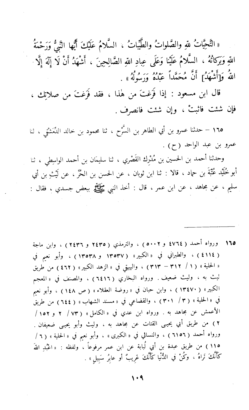 165 - حَدَّثَنَا عَمْرُو بْنُ أَبِي الطَّاهِرِ بْنِ السَّرْحِ، ثنا مَحْمُودُ بْنُ خَالِدٍ الدِّمَشْقِيُّ، ثنا عَمْرُو بْنُ عَبْدِ الْوَاحِدِ، ح , وَحَدَّثَنَا أَحْمَدُ بْنُ الْحُسَيْنِ بْنِ مُدْرِكٍ الْقِصْرِيُّ، ثنا سُلَيْمَانُ بْنُ أَحْمَدَ الْوَاسِطِيُّ، ثنا أَبُو خُلَيْدٍ عُتْبَةُ بْنُ حَمَّادٍ , قَالَا: ثنا ابْنُ ثَوْبَانَ، عَنِ الْحَسَنِ بْنِ الْحُرِّ، عَنْ لَيْثِ بْنِ أَبِي سُلَيْمٍ، عَنْ مُجَاهِدٍ، عَنِ ابْنِ عُمَرَ، قَالَ: أَخَذَ النَّبِيُّ صَلَّى اللهُ عَلَيْهِ وَسَلَّمَ بِبَعْضِ جَسَدِي فَقَالَ: §«كُنْ فِي الدُّنْيَا كَأَنَّكَ غَرِيبٌ أَوْ عَابِرُ سَبِيلٍ وَعُدَّ نَفْسَكَ مِنْ أَهْلِ الْقُبُورِ»