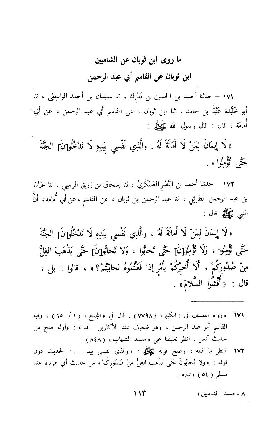 172 - حَدَّثَنَا أَحْمَدُ بْنُ النَّضْرِ الْعَسْكَرِيُّ، ثنا إِسْحَاقُ بْنُ زُرَيْقٍ الرَّاسِبِيُّ، ثنا عُثْمَانُ بْنُ عَبْدِ الرَّحْمَنِ الطَّرَائِفِيُّ، ثنا عَبْدُ الرَّحْمَنِ بْنُ ثَوْبَانَ، عَنِ الْقَاسِمِ، عَنْ أَبِي أُمَامَةَ، أَنَّ النَّبِيَّ صَلَّى اللهُ عَلَيْهِ وَسَلَّمَ قَالَ: §" لَا إِيمَانَ لِمَنْ لَا أَمَانَةَ لَهُ , وَالَّذِي نَفْسِي بِيَدِهِ لَا تَدْخُلُو [نَ] الْجَنَّةَ حَتَّى تُؤْمِنُوا , وَلَا تُؤْمِنُو [نَ] حَتَّى تَحَابُّوا وَلَا تَحَابُّو [نَ] حَتَّى يَذْهَبَ الْغِلُّ مِنْ صُدُورِكُمْ , أَلَا أُخْبِرُكُمْ بِأَمْرٍ إِذَا فَعَلْتُمُوهُ تَحَابَبْتُمْ؟: قَالُوا: بَلَى قَالَ: «أَفْشُوا السَّلَامَ»