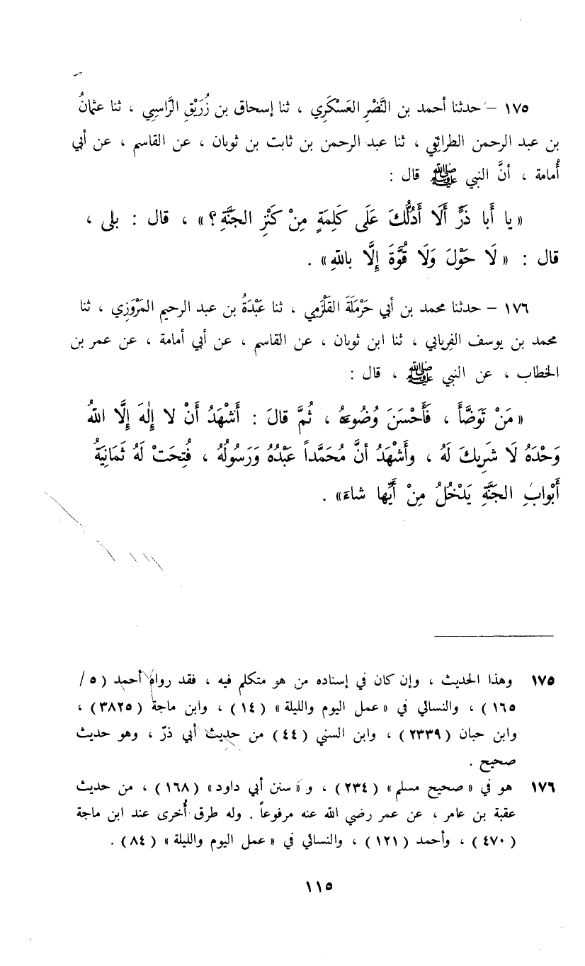 175 - حَدَّثَنَا أَحْمَدُ بْنُ النَّضْرِ الْعَسْكَرِيُّ، ثنا إِسْحَاقُ بْنُ زُرَيْقٍ الرَّاسِبِيِّ، ثنا عُثْمَانُ بْنُ عَبْدِ الرَّحْمَنِ الطَّرَائِفِيُّ، ثنا عَبْدُ الرَّحْمَنِ بْنُ ثَابِتِ بْنِ ثَوْبَانَ، عَنِ الْقَاسِمِ، عَنْ أَبِي أُمَامَةَ، أَنَّ النَّبِيَّ صَلَّى اللهُ عَلَيْهِ وَسَلَّمَ قَالَ: «يَا أَبَا ذَرٍّ §أَلَا أَدُلُّكَ عَلَى كَلِمَةٍ مِنْ كَنْزِ الْجَنَّةِ» قَالَ: بَلَى , قَالَ: «لَا حَوْلَ وَلَا قُوَّةَ إِلَّا بِاللَّهِ»