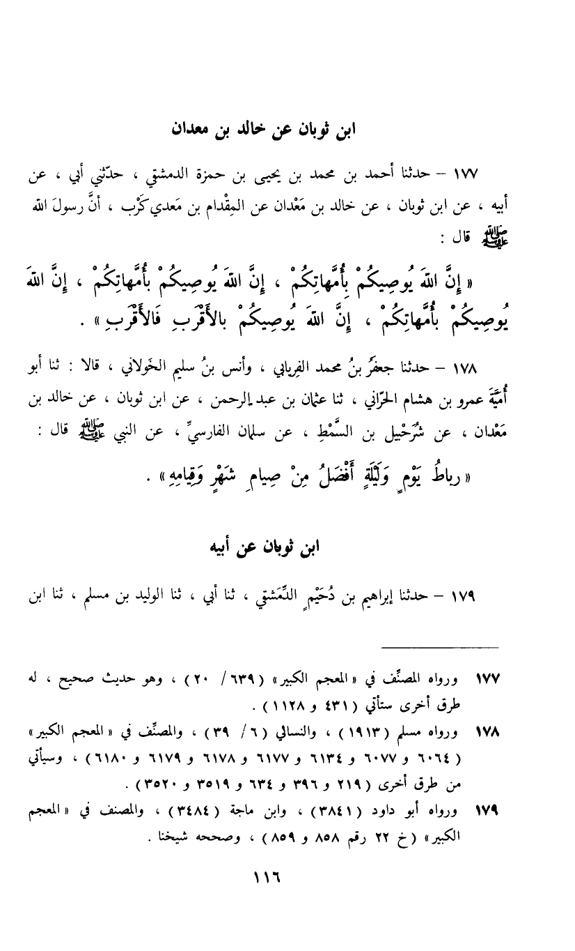 177 - حَدَّثَنَا أَحْمَدُ بْنُ مُحَمَّدِ بْنِ يَحْيَى بْنِ حَمْزَةَ الدِّمَشْقِيُّ، حَدَّثَنِي أَبِي، عَنْ أَبِيهِ، عَنِ ابْنِ ثَوْبَانَ، عَنْ خَالِدِ بْنِ مَعْدَانَ، عَنِ الْمِقْدَامِ بْنِ مَعْدِيكَرِبَ أَنَّ رَسُولَ اللَّهِ صَلَّى اللهُ عَلَيْهِ وَسَلَّمَ قَالَ: §«إِنَّ اللَّهَ يُوصِيكُمْ بِأُمَّهَاتِكُمْ , إِنَّ اللَّهَ يُوصِيكُمْ بِأُمَّهَاتِكُمْ , إِنَّ اللَّهَ يُوصِيكُمْ بِأُمَّهَاتِكُمْ , إِنَّ اللَّهَ يُوصِيكُمْ بِالْأَقْرَبِ فَالْأَقْرَبِ»