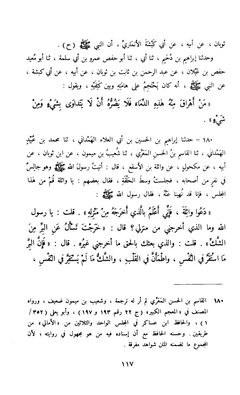 180 - حَدَّثَنَا إِبْرَاهِيمُ بْنُ الْحُسَيْنِ بْنِ أَبِي الْعَلَاءِ الْهَمْدَانِيُّ، ثنا مُحَمَّدُ بْنُ عُبَيْدٍ الْهَمْدَانِيُّ، ثنا الْقَاسِمُ بْنُ الْحَسَنِ الْمَعَرَّيُّ، ثنا شُعَيْبُ بْنُ مَيْمُونٍ، عَنِ ابْنِ ثَوْبَانَ، عَنْ أَبِيهِ، عَنْ مَكْحُولٍ، عَنْ وَاثِلَةَ بْنِ الْأَسْقَعِ، قَالَ: أَتَيْتُ رَسُولَ اللَّهِ صَلَّى اللهُ عَلَيْهِ وَسَلَّمَ وَهُوَ جَالِسٌ فِي نَفَرٍ مِنْ أَصْحَابِهِ فَجَلَسْتُ وَسَطَ الْحَلْقَةِ فَقَالَ بَعْضُهُمْ: يَا وَاثِلَةُ قُمْ مِنْ هَذَا الْمَجْلِسِ فَإِنَّا قَدْ نُهِيَنَا عَنْهُ , فَقَالَ رَسُولُ اللَّهِ صَلَّى اللهُ عَلَيْهِ وَسَلَّمَ: «دَعُوا وَاثِلَةَ فَإِنِّي أَعْلَمُ بِالَّذِي أَخْرَجَهُ مِنْ مَنْزِلِهِ» . قُلْتُ: يَا رَسُولَ اللَّهِ وَمَا الَّذِي أَخْرَجَنِي مِنْ مَنْزِلِي؟ قَالَ: «خَرَجْتَ تَسْأَلُ عَنِ الْبِرِّ مِنَ الشَّكِّ» قُلْتُ: وَالَّذِي بَعَثَكَ بِالْحَقِّ مَا أَخْرَجَنِي غَيْرُهُ , قَالَ: «فَإِنَّ §الْبِرَّ مَا اسْتَقَرَّ فِي النَّفْسِ , وَاطْمَأَنَّ فِي الْقَلْبِ , وَالشَّكُّ مَا لَمْ يَسْتَقِرَّ فِي النَّفْسِ وَلَمْ يَطْمَئِنَّ إِلَيْهِ الْقَلْبُ فَدَعْ مَا يَرِيبُكَ إِلَى مَا لَا يَرِيبُكُ , وَإِنْ أَفْتَاكَ الْمُفْتُونَ»
