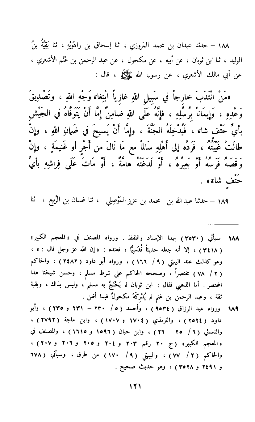 188 - حَدَّثَنَا عَبْدَانُ بْنُ مُحَمَّدٍ الْمَرْوَزِيُّ، ثنا إِسْحَاقُ بْنُ رَاهَوَيْهِ، ثنا بَقِيَّةُ بْنُ الْوَلِيدِ، ثنا ابْنُ ثَوْبَانَ، عَنْ أَبِيهِ، عَنْ مَكْحُولٍ، عَنْ عَبْدِ الرَّحْمَنِ بْنِ غَنْمٍ الْأَشْعَرِيِّ، عَنْ أَبِي مَالِكٍ الْأَشْعَرِيِّ، عَنْ رَسُولِ اللَّهِ صَلَّى اللهُ عَلَيْهِ وَسَلَّمَ قَالَ: §«مَنِ انْتَدَبَ خَارِجًا فِي سَبِيلِ اللَّهِ غَازِيًا ابْتِغَاءَ وَجْهِ اللَّهِ , وَتَصْدِيقَ وَعْدِهِ , وَإِيمَانًا بِرُسُلِهِ , فَإِنَّهُ عَلَى اللَّهِ ضَامِنٌ , إِمَّا أَنْ يَتَوَفَّاهُ فِي الْجَيْشِ بِأَيِّ حَتْفٍ شَاءَ فَيُدْخِلُهُ الْجَنَّةَ , وَإِمَّا أَنْ يَسِيحَ فِي ضَمَانِ اللَّهِ وَإِنْ طَالَتْ غَيْبَتُهُ فَرَدَّهُ إِلَى أَهْلِهِ سَالِمًا مَعَ مَا نَالَ مِنْ أَجْرٍ أَوْ غَنِيمَةٍ وَإِنْ وَقَصَهُ فَرَسُهُ أَوْ بَعِيرُهُ أَوْ لَدَغَتْهُ هَامَّةٌ أَوْ مَاتَ عَلَى فِرَاشِهِ بِأَيِّ حَتْفٍ شَاءَ»