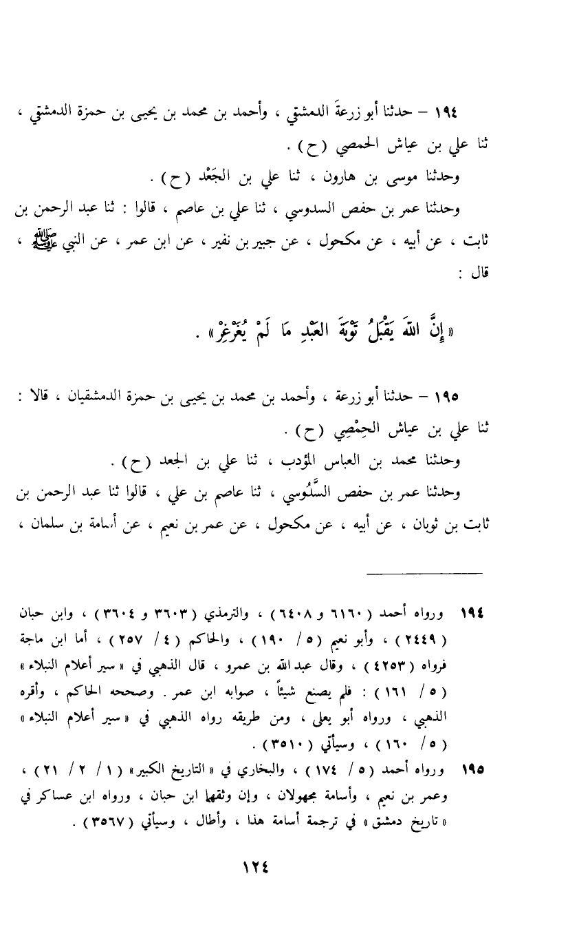 194 - حَدَّثَنَا أَبُو زُرْعَةَ الدِّمَشْقِيُّ، وَأَحْمَدُ بْنُ مُحَمَّدِ بْنِ يَحْيَى بْنِ حَمْزَةَ الدِّمَشْقِيُّ , ثنا عَلِيُّ بْنُ عَيَّاشٍ الْحِمْصِيُّ، ح , وَحَدَّثَنَا مُوسَى بْنُ هَارُونَ، ثنا عَلِيُّ بْنُ الْجَعْدِ، ح , وَحَدَّثَنَا عُمَرُ بْنُ حَفْصٍ السَّدُوسِيُّ، ثنا عَلِيُّ بْنُ عَاصِمٍ، قَالُوا: ثنا عَبْدُ الرَّحْمَنِ بْنُ ثَابِتٍ، عَنْ أَبِيهِ، عَنْ مَكْحُولٍ، عَنْ جُبَيْرِ بْنِ نُفَيْرٍ، عَنِ ابْنِ عُمَرَ، عَنِ النَّبِيِّ صَلَّى اللهُ عَلَيْهِ وَسَلَّمَ قَالَ: «إِنَّ §اللَّهَ يَقْبَلُ تَوْبَةَ الْعَبْدِ مَا لَمْ يُغَرْغِرْ»