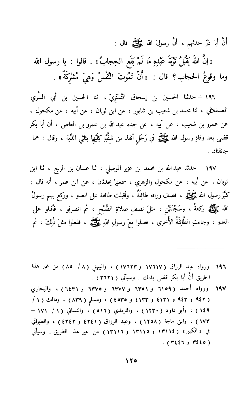 196 - حَدَّثَنَا الْحُسَيْنُ بْنُ إِسْحَاقَ التُّسْتَرِيُّ، ثنا الْحُسَيْنُ بْنُ أَبِي السَّرِيِّ الْعَسْقَلَانِيُّ، ثنا مُحَمَّدُ بْنُ شُعَيْبِ بْنِ شَابُورَ، عَنِ ابْنِ ثَوْبَانَ، عَنْ أَبِيهِ، عَنْ مَكْحُولٍ، عَنْ عَمْرِو بْنِ شُعَيْبٍ، عَنْ أَبِيهِ، عَنْ جَدِّهِ عَبْدِ اللَّهِ بْنِ عَمْرِو بْنِ الْعَاصِ، أَنَّ أَبَا بَكْرٍ، §قَضَى بَعْدَ وَفَاةِ رَسُولِ اللَّهِ صَلَّى اللهُ عَلَيْهِ وَسَلَّمَ فِي رَجُلٍ أُنْفِذَ مِنْ شِقَّيْهِ كِلَيْهِمَا بِثُلُثَيِ الدِّيَةِ وَقَالَ: «هُمَا جَائِفَتَانِ»