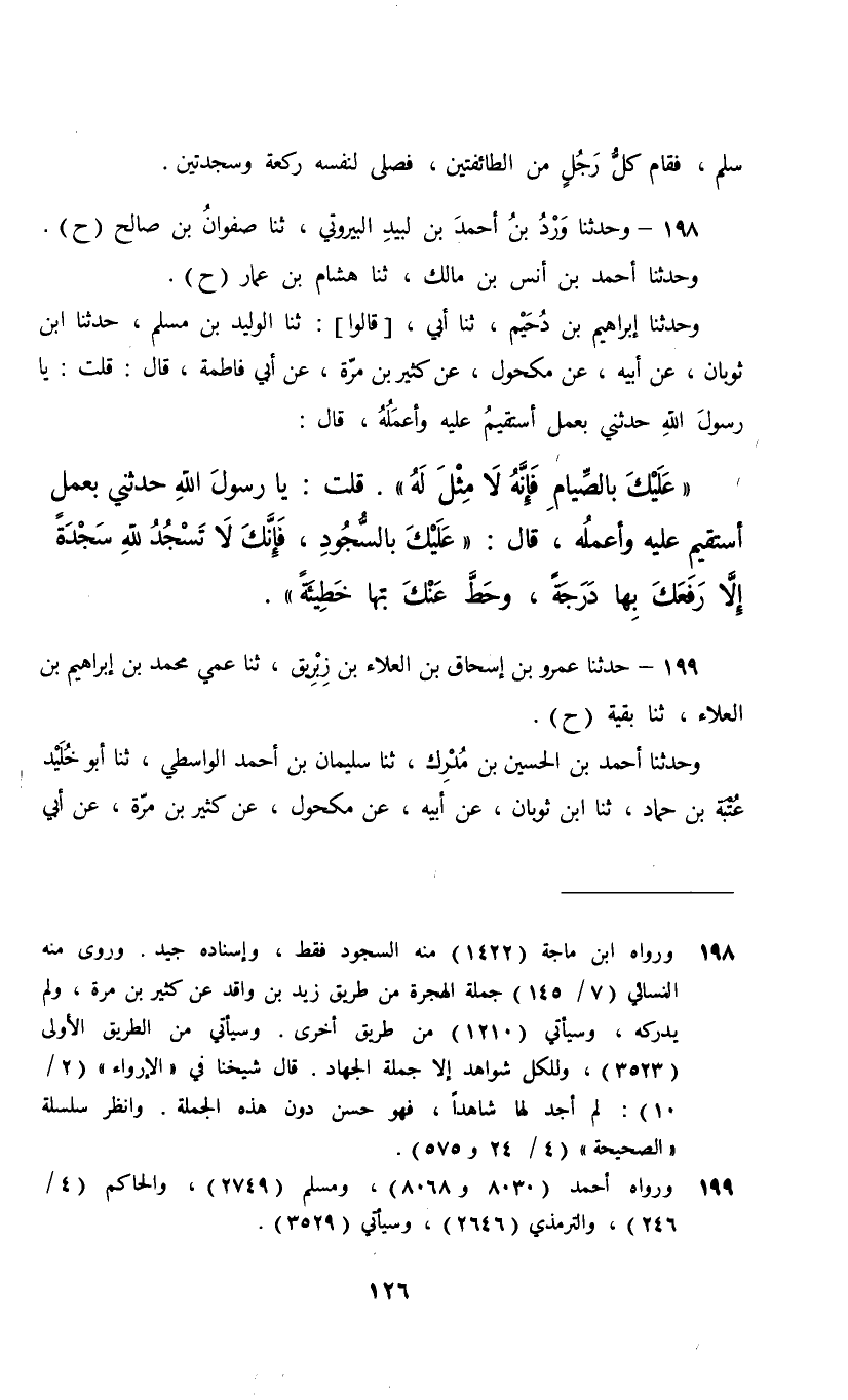 198 - وَحَدَّثَنَا وَرْدُ بْنُ أَحْمَدَ بْنِ لَبِيدٍ الْبَيْرُوتِيُّ، ثنا صَفْوَانُ بْنُ صَالِحٍ، ح , وَحَدَّثَنَا أَحْمَدُ بْنُ أَنَسِ بْنِ مَالِكٍ، ثنا هِشَامُ بْنُ عَمَّارٍ، ح , وَحَدَّثَنَا إِبْرَاهِيمُ بْنُ دُحَيْمٍ، ثنا أَبِي، قَالُوا: ثنا الْوَلِيدُ بْنُ مُسْلِمٍ، حَدَّثَنَا ابْنُ ثَوْبَانَ، عَنْ أَبِيهِ، عَنْ مَكْحُولٍ، عَنْ كَثِيرِ بْنِ مُرَّةَ، عَنْ أَبِي فَاطِمَةَ، قَالَ: قُلْتُ يَا رَسُولَ اللَّهِ حَدِّثْنِي بِعَمَلٍ، أَسْتَقِيمُ عَلَيْهِ وَأَعْمَلُهُ , قَالَ: «§عَلَيْكَ بِالصِّيَامِ فَإِنَّهُ لَا مِثْلَ لَهُ» قُلْتُ: يَا رَسُولَ اللَّهِ حَدِّثْنِي بِعَمَلٍ أَسْتَقِيمُ عَلَيْهِ وَأَعْمَلُهُ قَالَ: «عَلَيْكَ بِالسُّجُودِ فَإِنَّكَ لَا تَسْجُدُ لِلَّهِ سَجْدَةً إِلَّا رَفَعَكَ بِهَا دَرَجَةً وَحَطَّ عَنْكَ بِهَا خَطِيئَةً»