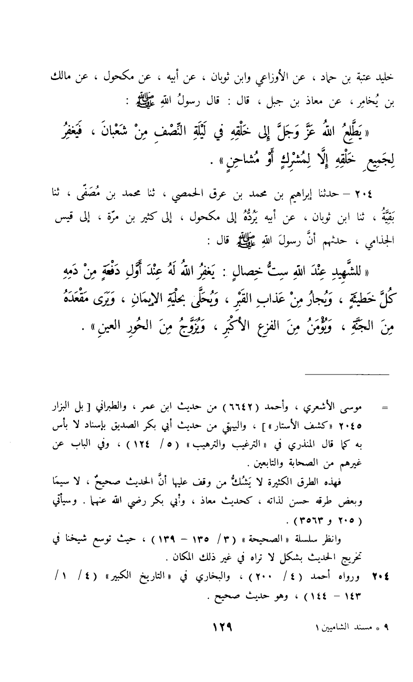 204 - حَدَّثَنَا إِبْرَاهِيمُ بْنُ مُحَمَّدِ بْنِ عِرْقٍ الْحِمْصِيُّ، ثنا مُحَمَّدُ بْنُ مُصَفًّى، ثنا بَقِيَّةُ، ثنا ابْنُ ثَوْبَانَ، عَنْ أَبِيهِ، يَرُدَّهُ إِلَى مَكْحُولٍ إِلَى كَثِيرِ بْنِ مُرَّةَ , إِلَى قَيْسٍ الْجُذَامِيِّ , حَدَّثَهُمْ أَنَّ رَسُولَ اللَّهِ صَلَّى اللهُ عَلَيْهِ وَسَلَّمَ قَالَ: " §لِلشَّهِيدِ عِنْدَ اللَّهِ سِتُّ خِصَالٍ: يَغْفِرُ اللَّهُ لَهُ عِنْدَ أَوَّلِ دَفْعَةٍ مِنْ دَمِهِ كُلَّ خَطِيئَةٍ , وَيُجَارُ مِنْ عَذَابِ الْقَبْرِ , وَيُحَلَّى بِحِلْيَةِ الْإِيمَانِ , وَيَرَى مَقْعَدَهُ مِنَ الْجَنَّةِ , وَيُؤَمَّنُ مِنَ الْفَزَعِ الْأَكْبَرِ , وَيُزَوَّجُ مِنَ الْحُورِ الْعِينِ "