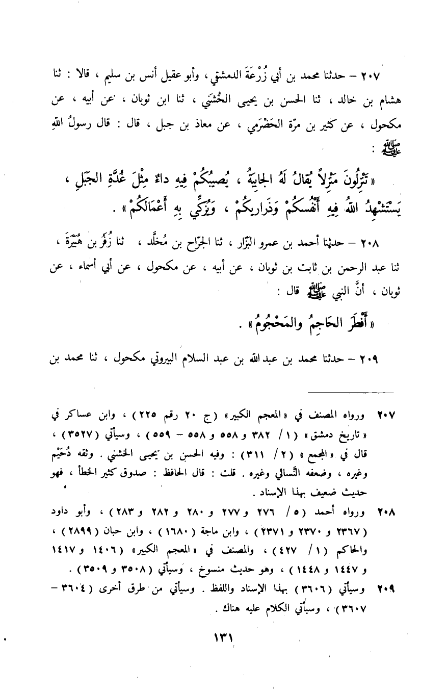 208 - حَدَّثَنَا أَحْمَدُ بْنُ عَمْرٍو الْبَزَّارُ، ثنا الْجَرَّاحُ بْنُ مَخْلَدٍ، ثنا زُفَرُ بْنُ هُبَيْرَةَ، ثنا عَبْدُ الرَّحْمَنِ بْنُ ثَابِتِ بْنِ ثَوْبَانَ، عَنْ أَبِيهِ، عَنْ مَكْحُولٍ، عَنْ أَبِي أَسْمَاءَ، عَنْ ثَوْبَانَ، أَنَّ النَّبِيَّ صَلَّى اللهُ عَلَيْهِ وَسَلَّمَ قَالَ: §«أَفْطَرَ الْحَاجِمُ وَالْمَحْجُومُ»