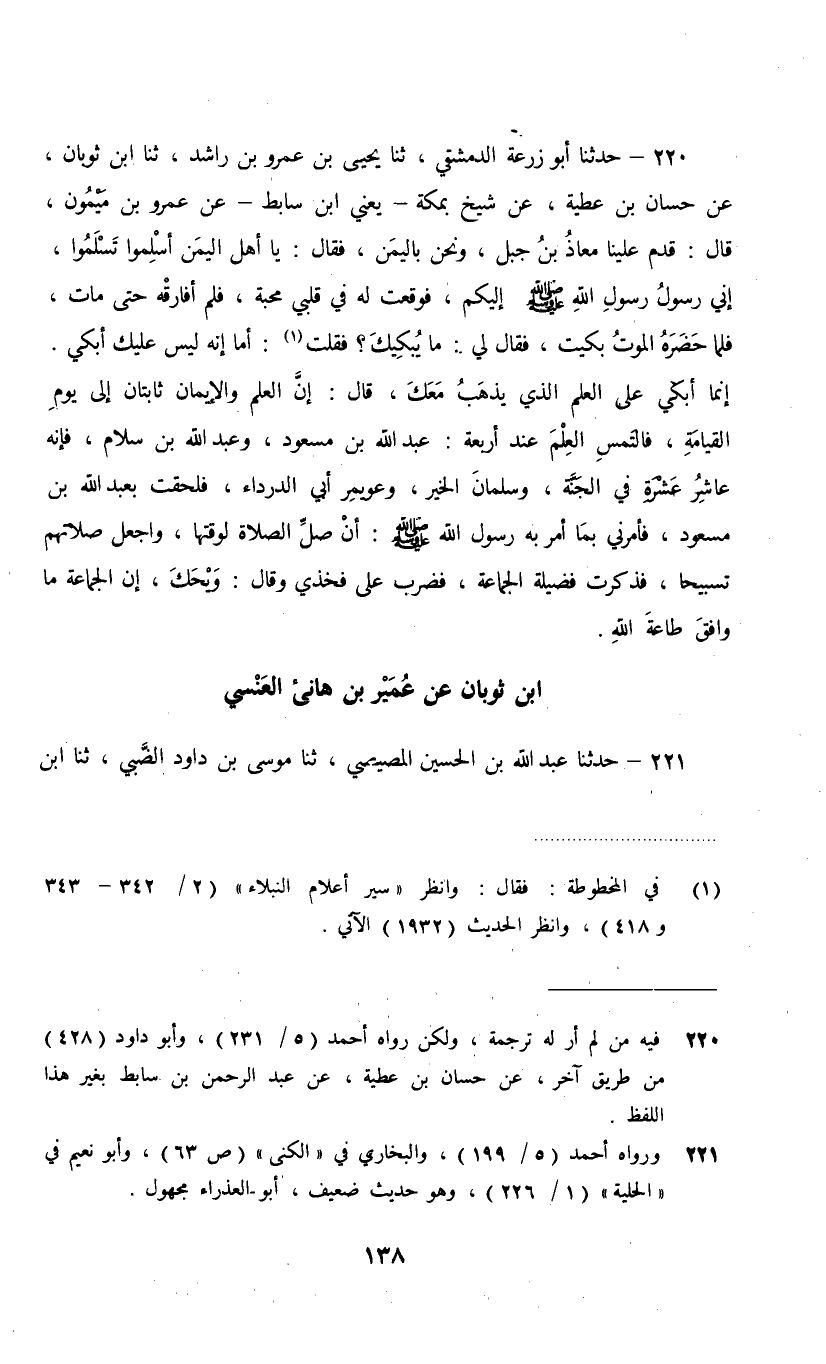 220 - حَدَّثَنَا أَبُو زُرْعَةَ الدِّمَشْقِيُّ، ثنا يَحْيَى بْنُ عَمْرِو بْنِ رَاشِدٍ، ثنا ابْنُ ثَوْبَانَ، عَنْ حَسَّانَ بْنِ عَطِيَّةَ، عَنْ شَيْخٍ بِمَكَّةَ يَعْنِي ابْنَ سَابِطٍ عَنْ عَمْرِو بْنِ مَيْمُونٍ، قَالَ: قَدِمَ عَلَيْنَا مُعَاذُ بْنُ جَبَلٍ وَنَحْنُ بِالْيَمَنِ، فَقَالَ: يَا أَهْلَ الْيَمَنِ أَسْلِمُوا تَسْلَمُوا , إِنِّي رَسُولُ رَسُولِ اللَّهِ صَلَّى اللهُ عَلَيْهِ وَسَلَّمَ إِلَيْكُمْ فَوَقَعَتْ لَهُ فِي قَلْبِي مَحَبَّةٌ، فَلَمْ أُفَارِقْهُ حَتَّى مَاتَ , فَلَمَّا حَضَرَهُ الْمَوْتُ بَكَيْتُ , فَقَالَ لِي: مَا يُبْكِيكَ؟ فَقُلْتُ: أَمَا إِنَّهُ لَيْسَ عَلَيْكَ أَبْكِي إِنَّمَا أَبْكِي عَلَى الْعِلْمِ الَّذِي يَذْهَبُ مَعَكَ، قَالَ: إِنَّ الْعِلْمَ وَالْإِيمَانَ ثَابِتَانِ إِلَى يَوْمِ الْقِيَامَةِ، فَالْتَمِسِ الْعِلْمَ عِنْدَ أَرْبَعَةٍ , عَبْدِ اللَّهِ بْنِ مَسْعُودٍ، وَعَبْدِ اللَّهِ بْنِ سَلَامٍ فَإِنَّهُ عَاشِرُ عَشْرَةٍ فِي الْجَنَّةِ , وَسَلْمَانَ الْخَيْرِ، وَعُوَيْمِرٍ أَبِي الدَّرْدَاءِ، فَلَحِقْتُ بِعَبْدِ اللَّهِ بْنِ مَسْعُودٍ فَأَمَرَنِي بِمَا أَمَرَ بِهِ رَسُولُ اللَّهِ صَلَّى اللهُ عَلَيْهِ وَسَلَّمَ أَنْ §«صَلِّ الصَّلَاةَ لِوَقْتِهَا وَاجْعَلْ صَلَاتَهُمْ تَسْبِيحًا» فَذَكَرْتُ فَضِيلَةَ الْجَمَاعَةِ فَضَرَبَ عَلَى فَخِذِي وَقَالَ: وَيْحَكَ إِنَّ الْجَمَاعَةَ مَا وَافَقَ طَاعَةَ اللَّهِ