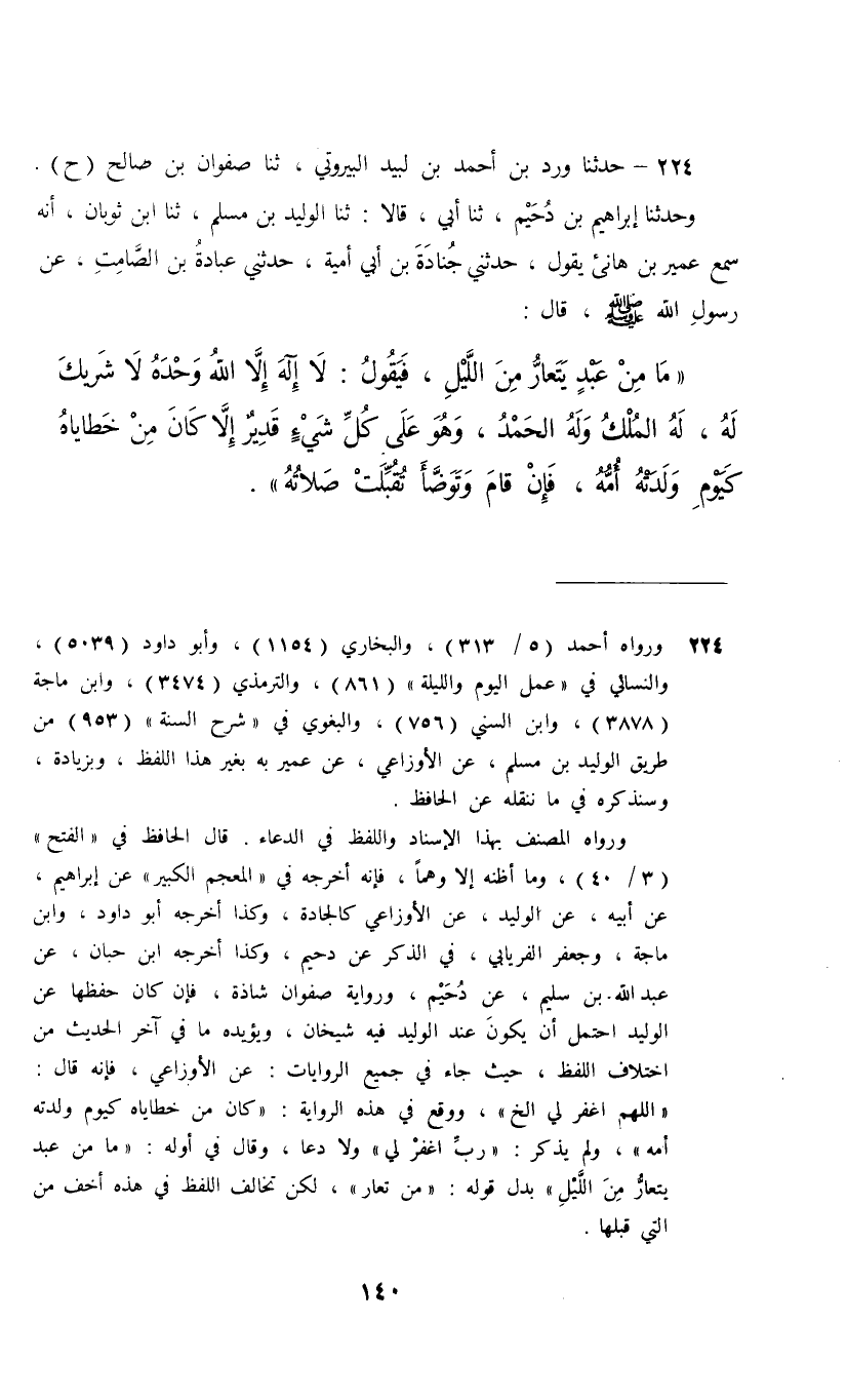 224 - حَدَّثَنَا وَرْدُ بْنُ أَحْمَدَ بْنِ لَبِيدٍ الْبَيْرُوتِيُّ، ثنا صَفْوَانُ بْنُ صَالِحٍ، ح , وَحَدَّثَنَا إِبْرَاهِيمُ بْنُ دُحَيْمٍ، ثنا أَبِي قَالَا: ثنا الْوَلِيدُ بْنُ مُسْلِمٍ، ثنا ابْنُ ثَوْبَانَ، أَنَّهُ سَمِعَ عُمَيْرَ بْنَ هَانِئٍ، يَقُولُ: حَدَّثَنِي جُنَادَةُ بْنُ أَبِي أُمَيَّةَ، حَدَّثَنِي عُبَادَةُ بْنُ الصَّامِتِ، عَنْ رَسُولِ اللَّهِ صَلَّى اللهُ عَلَيْهِ وَسَلَّمَ قَالَ: " §مَا مِنْ عَبْدٍ يَتَعَارَّ مِنَ اللَّيْلِ فَيَقُولُ: لَا إِلَهَ إِلَّا اللَّهُ وَحْدَهُ لَا شَرِيكَ لَهُ، لَهُ الْمُلْكُ وَلَهُ الْحَمْدُ وَهُوَ عَلَى كُلِّ شَيْءٍ قَدِيرٍ إِلَّا كَانَ مِنْ خَطَايَاهُ كَيَوْمِ وَلَدَتْهُ أُمُّهُ، فَإِنْ قَامَ وَتَوَضَّأَ تُقُبِّلَتْ صَلَاتُهُ "