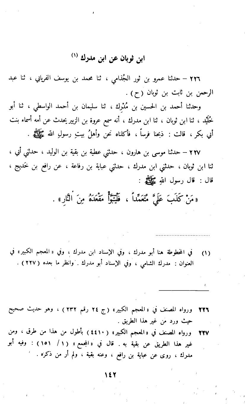 227 - حَدَّثَنَا مُوسَى بْنُ هَارُونَ، حَدَّثَنِي عَطِيَّةُ بْنُ بَقِيَّةَ بْنِ الْوَلِيدِ، حَدَّثَنِي أَبِي، ثنا ابْنُ ثَوْبَانَ، حَدَّثَنِي ابْنُ مُدْرِكٍ، حَدَّثَنِي عَبَايَةُ بْنُ رِفَاعَةَ، عَنْ رَافِعِ بْنِ خَدِيجٍ، قَالَ: قَالَ رَسُولُ اللَّهِ صَلَّى اللهُ عَلَيْهِ وَسَلَّمَ: §«مَنْ كَذَبَ عَلَيَّ مُتَعَمِّدًا فَلْيَتَبَوَّأْ مَقْعَدَهُ مِنَ النَّارِ»