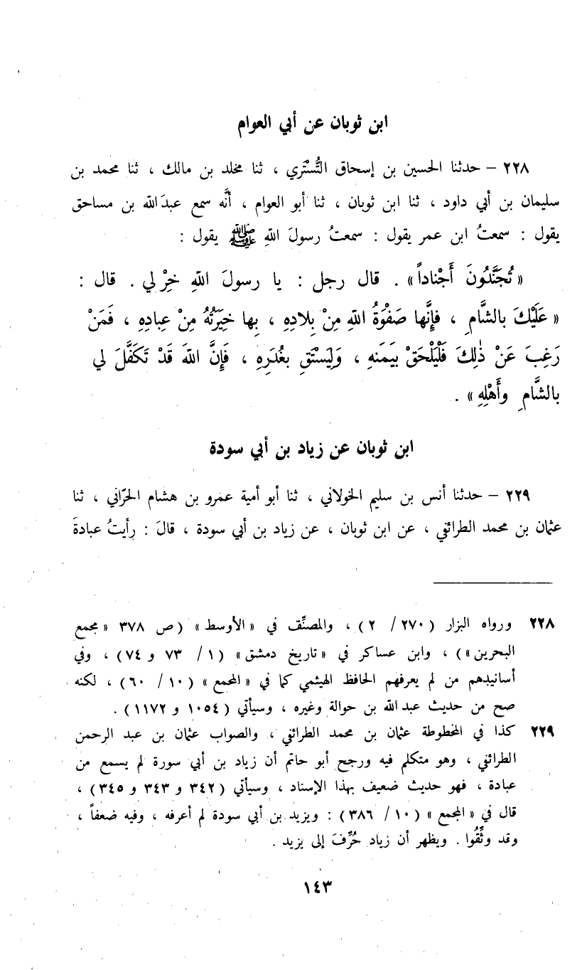 228 - حَدَّثَنَا الْحُسَيْنُ بْنُ إِسْحَاقَ التُّسْتَرِيُّ، ثنا مَخْلَدُ بْنُ مَالِكٍ، ثنا مُحَمَّدُ بْنُ سُلَيْمَانَ بْنِ أَبِي دَاوُدَ، ثنا ابْنُ ثَوْبَانَ، ثنا أَبُو الْعَوَّامِ، أَنَّهُ سَمِعَ عَبْدَ اللَّهِ بْنَ مُسَاحِقٍ، يَقُولُ: سَمِعْتُ ابْنَ عُمَرَ، يَقُولُ: سَمِعْتُ رَسُولَ اللَّهِ صَلَّى اللهُ عَلَيْهِ وَسَلَّمَ يَقُولُ: «تُجَنِّدُونَ أَجْنَادًا» قَالَ رَجُلٌ: يَا رَسُولَ اللَّهِ خِرْ لِي، قَالَ: §" عَلَيْكَ بِالشَّامِ فَإِنَّهَا صَفْوَةُ اللَّهِ مِنْ بِلَادِهِ , بِهَا خِيرَتُهُ مَنْ عِبَادِهِ، فَمَنْ رَغِبَ عَنْ ذَلِكَ فَلْيَلْحَقْ بِيَمَنِهِ وَلْيَسْتَقِ بِغُدَرِهِ , فَإِنَّ اللَّهَ قَدْ تَكَفَّلَ لِي بِالشَّامِ وَأَهْلِهِ