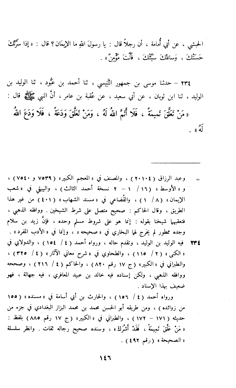 234 - حَدَّثَنَا مُوسَى بْنُ جُمْهُوَرٍ التِّنِّيسِيُّ، ثنا أَحْمَدُ بْنُ عبودٍ، ثنا الْوَلِيدُ بْنُ الْوَلِيدِ، ثنا ابْنُ ثَوْبَانَ، عَنْ أَبِي سَعِيدٍ، عَنْ عُقْبَةَ بْنِ عَامِرٍ، أَنَّ النَّبِيَّ صَلَّى اللهُ عَلَيْهِ وَسَلَّمَ قَالَ: «§مَنْ تَعَلَّقَ تَمِيمَةً فَلَا أَتَمَّ اللَّهُ لَهُ، وَمَنْ تَعَلَّقَ وَدَعَةً فَلَا وَدَعَ اللَّهُ لَهُ»