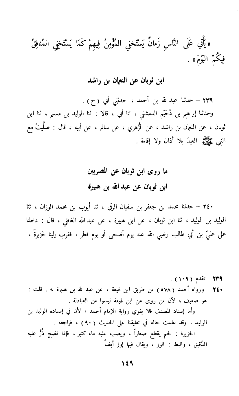 239 - حَدَّثَنَا عَبْدُ اللَّهِ بْنُ أَحْمَدَ، حَدَّثَنِي أَبِي، ح، وَحَدَّثَنَا إِبْرَاهِيمُ بْنُ دُحَيْمٍ الدِّمَشْقِيُّ، ثنا أَبِي، قَالَا: ثنا الْوَلِيدُ بْنُ مُسْلِمٍ، ثنا ابْنُ ثَوْبَانَ، عَنِ النُّعْمَانِ بْنِ رَاشِدٍ، عَنِ الزُّهْرِيِّ، عَنْ سَالِمٍ، عَنْ أَبِيهِ، قَالَ: §«صَلَّيْتُ مَعَ النَّبِيِّ صَلَّى اللهُ عَلَيْهِ وَسَلَّمَ الْعِيدَ بِلَا أَذَانٍ وَلَا إِقَامَةٍ»