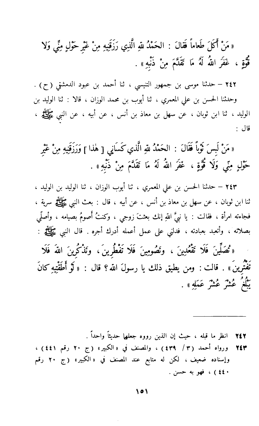 242 - حَدَّثَنَا مُوسَى بْنُ جُمْهُوَرٍ التِّنِّيسِيُّ، ثنا أَحْمَدُ بْنُ عبودٍ الدِّمَشْقِيُّ، ح , وَحَدَّثَنَا الْحَسَنُ بْنُ عَلِيٍّ الْمَعْمَرِيُّ، ثنا أَيُّوبُ بْنُ مُحَمَّدٍ الْوَزَّانُ، قَالَا: ثنا الْوَلِيدُ بْنُ الْوَلِيدِ، ثنا ابْنُ ثَوْبَانَ، عَنْ سَهْلِ بْنِ مُعَاذِ بْنِ أَنَسٍ، عَنْ أَبِيهِ، عَنِ النَّبِيِّ صَلَّى اللهُ عَلَيْهِ وَسَلَّمَ قَالَ: " §مَنْ لَبِسَ ثَوْبًا فَقَالَ: الْحَمْدُ لِلَّهِ الَّذِي كَسَانِي [هَذَا] وَرَزَقَنِيهُ مِنْ غَيْرِ حَوْلٍ مِنِّي وَلَا قُوَّةٍ غَفَرَ اللَّهُ لَهُ مَا تَقَدَّمَ مِنْ ذَنْبِهِ "