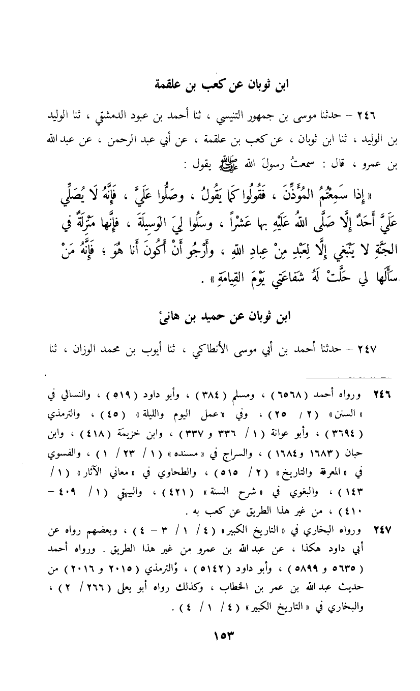 246 - حَدَّثَنَا مُوسَى بْنُ جُمْهُوَرٍ التِّنِّيسِيُّ، ثنا أَحْمَدُ بْنُ عبودٍ الدِّمَشْقِيُّ، ثنا الْوَلِيدُ بْنُ الْوَلِيدِ، ثنا ابْنُ ثَوْبَانَ، عَنْ كَعْبِ بْنِ عَلْقَمَةَ، عَنْ أَبِي عَبْدِ الرَّحْمَنِ، عَنْ عَبْدِ اللَّهِ بْنِ عَمْرٍو، قَالَ: سَمِعْتُ رَسُولَ اللَّهِ صَلَّى اللهُ عَلَيْهِ وَسَلَّمَ يَقُولُ: §«إِذَا سَمِعْتُمُ الْمُؤَذِّنَ فَقُولُوا كَمَا يَقُولُ وَصَلُّوا عَلَيَّ فَإِنَّهُ لَا يُصَلِّي عَلَيَّ أَحَدٌ إِلَّا صَلَّى اللَّهُ عَلَيْهِ بِهَا عَشْرًا وَسَلُوا لِيَ الْوَسِيلَةَ؛ فَإِنَّهَا مَنْزِلَةٌ فِي الْجَنَّةِ لَا يَنْبَغِي إِلَّا لِعَبْدٍ مِنْ عِبَادِ اللَّهِ وَأَرْجُو أَنْ أَكُونَ أَنَا هُوَ، فَإِنَّهُ مَنْ سَأَلَهَا لِي حَلَّتْ لَهُ شَفَاعَتِي يَوْمَ الْقِيَامَةِ»