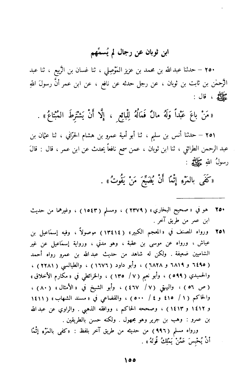 250 - حَدَّثَنَا عَبْدُ اللَّهِ بْنُ مُحَمَّدِ بْنِ عَزِيزٍ الْمَوْصِلِيُّ، ثنا غَسَّانُ بْنُ الرَّبِيعِ، ثنا عَبْدُ الرَّحْمَنِ بْنُ ثَابِتِ بْنِ ثَوْبَانَ، عَنْ رَجُلٍ، حَدَّثَهُ , عَنْ نَافِعٍ، عَنِ ابْنِ عُمَرَ، أَنَّ رَسُولَ اللَّهِ صَلَّى اللهُ عَلَيْهِ وَسَلَّمَ قَالَ: §«مَنْ بَاعَ عَبْدًا وَلَهُ مَالٌ فَمَالُهُ لِلْبَائِعِ إِلَّا أَنْ يَشْتَرِطَ الْمُبْتَاعُ»
