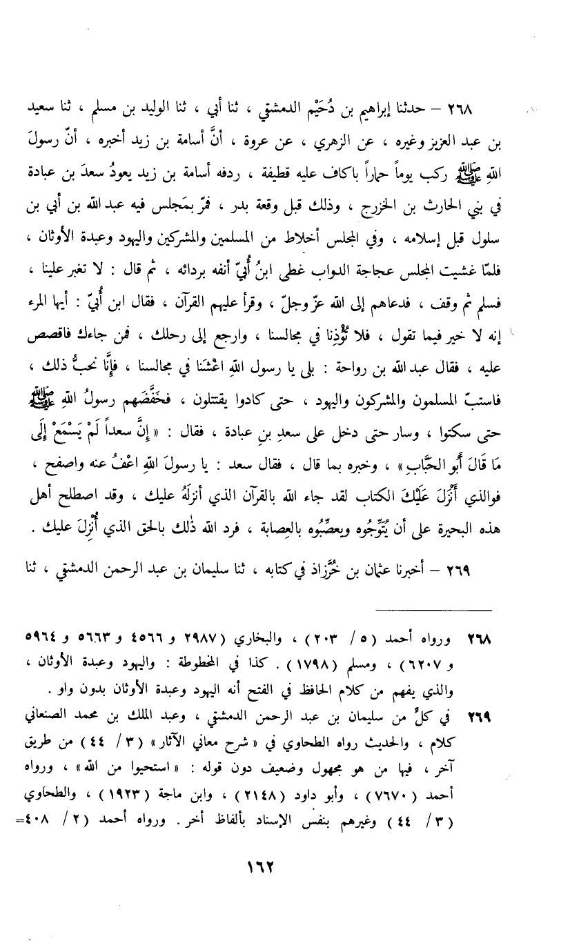 268 - حَدَّثَنَا إِبْرَاهِيمُ بْنُ دُحَيْمٍ الدِّمَشْقِيُّ، ثنا أَبِي، ثنا الْوَلِيدُ بْنُ مُسْلِمٍ، ثنا سَعِيدُ بْنُ عَبْدِ الْعَزِيزِ، وَغَيْرُهُ، عَنِ الزُّهْرِيِّ، عَنْ عُرْوَةَ، أَنَّ أُسَامَةَ بْنَ زَيْدٍ، أَخْبَرَهُ أَنَّ رَسُولَ اللَّهِ صَلَّى اللهُ عَلَيْهِ وَسَلَّمَ رَكِبَ يَوْمًا حِمَارًا بِإِكَافٍ عَلَيْهِ قَطِيفَةٌ , رِدْفُهُ أُسَامَةُ بْنُ زَيْدٍ يَعُودُ سَعْدَ بْنَ عُبَادَةَ فِي بَنِي الْحَارِثِ بْنِ الْخَزْرَجِ وَذَلِكَ قَبْلَ وَقْعَةِ بَدْرٍ , فَمَرَّ بِمَجْلِسٍ فِيهِ عَبْدُ اللَّهِ بْنِ أُبَيِّ ابْنِ سَلُولٍ قَبْلَ إِسْلَامِهِ وَفِي الْمَجْلِسِ أَخْلَاطٌ مِنَ الْمُسْلِمِينَ وَالْمُشْرِكِينَ وَالْيَهُوَدِ وَعَبْدَةِ الْأَوْثَانِ , فَلَمَّا غَشِيَتِ الْمَجْلِسَ عَجَاجَةُ الدَّوَابِّ غَطَّى ابْنُ أُبَيٍّ أَنْفَهُ بِرِدَائِهِ ثُمَّ قَالَ: لَا تُغْبِرُ عَلَيْنَا فَسَلَّمَ ثُمَّ وَقَفَ فَدَعَاهُمْ إِلَى اللَّهِ عَزَّ وَجَلَّ وَقَرَأَ عَلَيْهِمُ الْقُرْآنَ , فَقَالَ ابْنُ أُبَيٍّ: أَيُّهَا الْمَرْءُ إِنَّهُ لَا خَيْرَ فِيمَا تَقُولُ فَلَا تُؤْذِنَا فِي مَجَالِسَنَا وَارْجِعْ إِلَى رَحْلِكَ، فَمَنْ جَاءَكَ فَاقْصُصْ عَلَيْهِ , فَقَالَ عَبْدُ اللَّهِ بْنُ رَوَاحَةَ: بَلَى يَا رَسُولَ اللَّهِ اغْشَنَا فِي مَجَالِسَنَا فَإِنَّا نُحِبُّ ذَلِكَ فَاسْتَبَّ الْمُسْلِمُونَ وَالْمُشْرِكُونَ وَالْيَهُوَدُ حَتَّى كَادُوا يَقْتَتِلُونَ فَخَفَّضَهُمْ رَسُولُ اللَّهِ صَلَّى اللهُ عَلَيْهِ وَسَلَّمَ حَتَّى سَكَتُوا , وَسَارَ حَتَّى دَخَلَ عَلَى سَعْدِ بْنِ عُبَادَةَ , فَقَالَ: «إِنَّ سَعْدًا لَمْ يَسْمَعْ إِلَى مَا قَالَ أَبُو الْحُبَابِ» وَخَبَّرَهُ بِمَا قَالَ , فَقَالَ سَعْدٌ: يَا رَسُولَ اللَّهِ اعْفُ عَنْهُ وَاصْفَحْ فَوَالَّذِي أَنْزَلَ عَلَيْكَ الْكِتَابَ لَقَدْ جَاءَ اللَّهُ بِالْقُرْآنِ الَّذِي أَنْزَلَهُ عَلَيْكَ وَقَدِ §اصْطَلَحَ أَهْلُ هَذِهِ الْبُحَيْرَةِ عَلَى أَنْ يُتَوِّجُوهُ وَيُعَصِّبُوهُ بِالْعُصَابَةِ، فَرَدَّ اللَّهُ ذَلِكَ بِالْحَقِّ الَّذِي أُنْزِلَ عَلَيْكَ